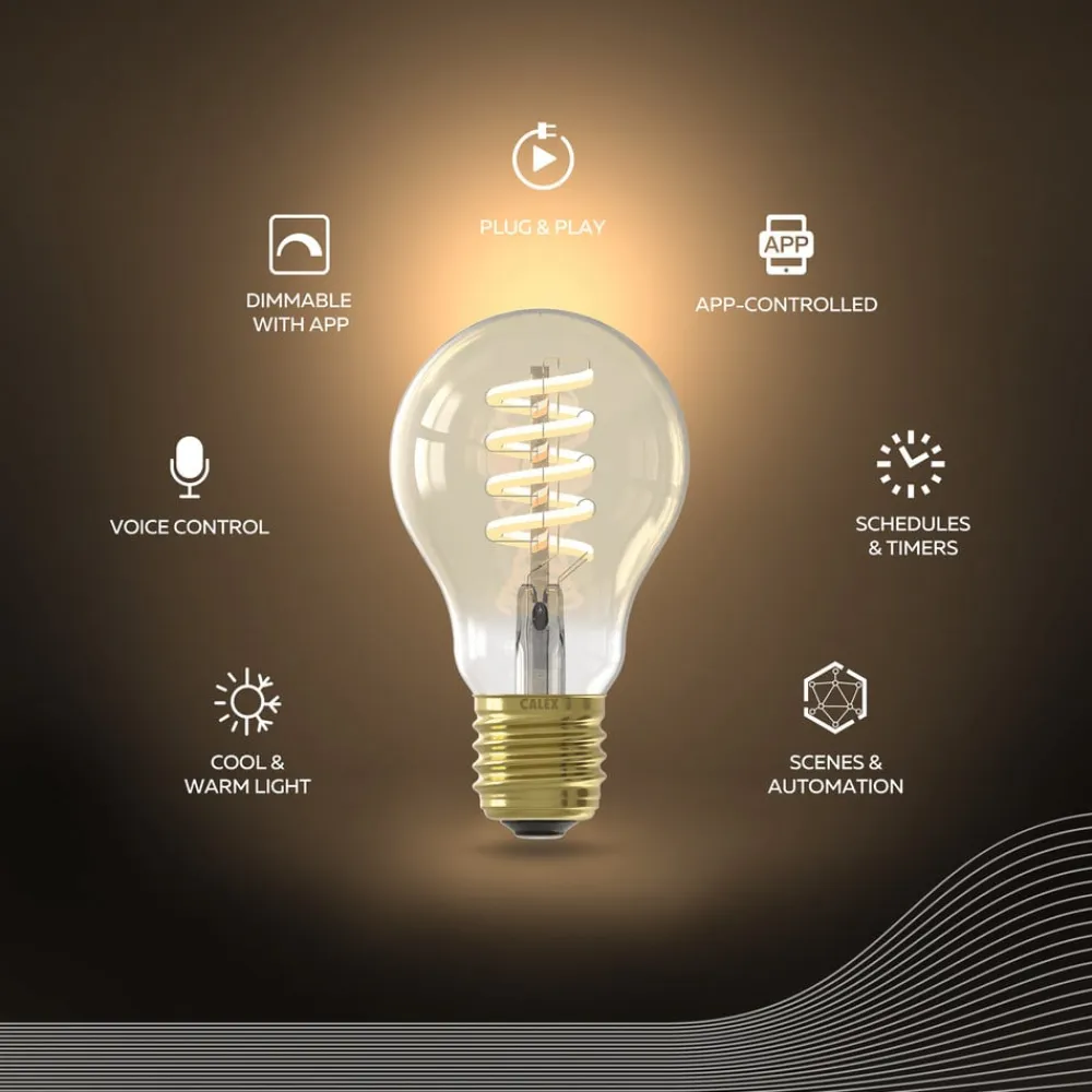 Denne smarte LED-filamentpære i vintage-stil er en berigelse til ethvert hjem. Den gyldne belægning på glasset skaber en særlig hyggelig lysstemning, og det smukke design gør pæren perfekt til lamper uden lampeskærm. Via Calex-appen kan lyset fleksibelt indstilles fra kølig hvid til ekstra varmhvidt lys til afslappede øjeblikke – naturligvis også fjernbetjent dæmpbar og fuldt tilpasselig.