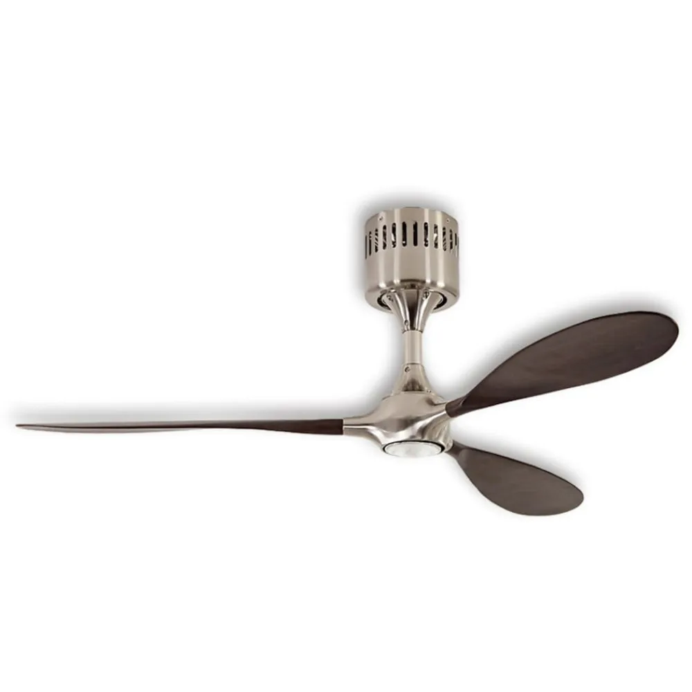 Tre slanke vinger i padleform giver denne loftventilator sit karakteristiske udseende. De tre vinger er fremstillet af massivt træ og suppleres af et hus i børstet kromlook. Fjernbetjening og vægbeslag medfølger. En dæmpbar E27 LED-pære medfølger.