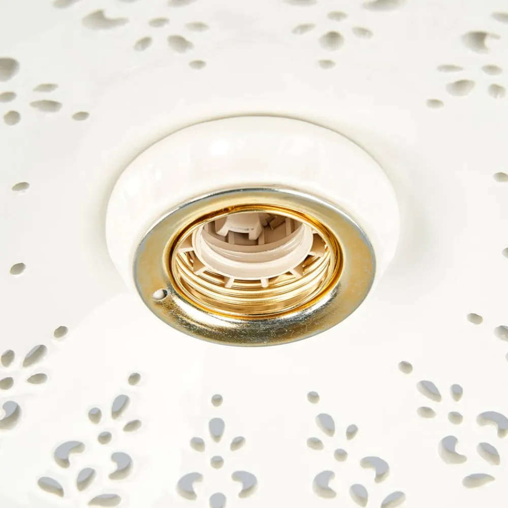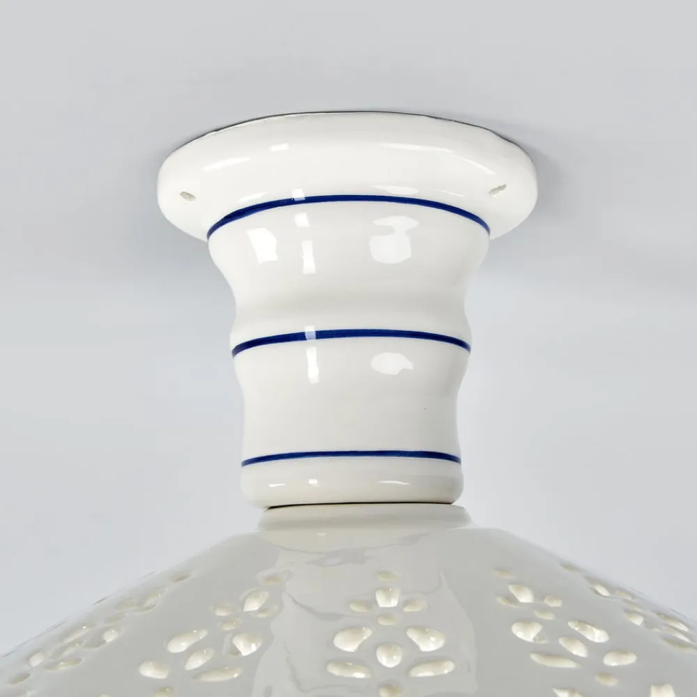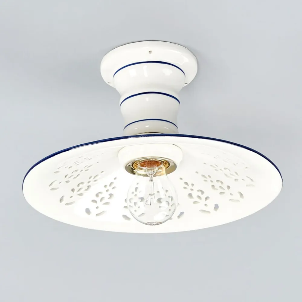 Charmerende AMENO keramisk loftlampe Denne charmerende AMENO loftlampe er den perfekte tilføjelse til et rum i landlig stil. Den hvidglaserede keramikskærm med sit dekorative perforerede mønster har en blå kant rundt om, som også findes på loftbeslaget. AMENO understøtter den hyggelige flair i landhusstilen. Lyset reflekteres godt og sendes nedad.