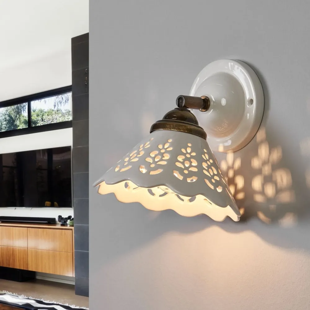 Ædel keramisk væglampe PIZZO Denne charmerende væglampe PIZZO er den helt rigtige til romantisk indrettede rum. Den hvidglaserede keramikskærm med det dekorative hulmønster og den buede kant minder om blondestof og giver romantisk flair. Lyset reflekteres godt og sendes ud foran. Ved hjælp af et kugleled kan skærmen justeres i forhold til lysbehovet.