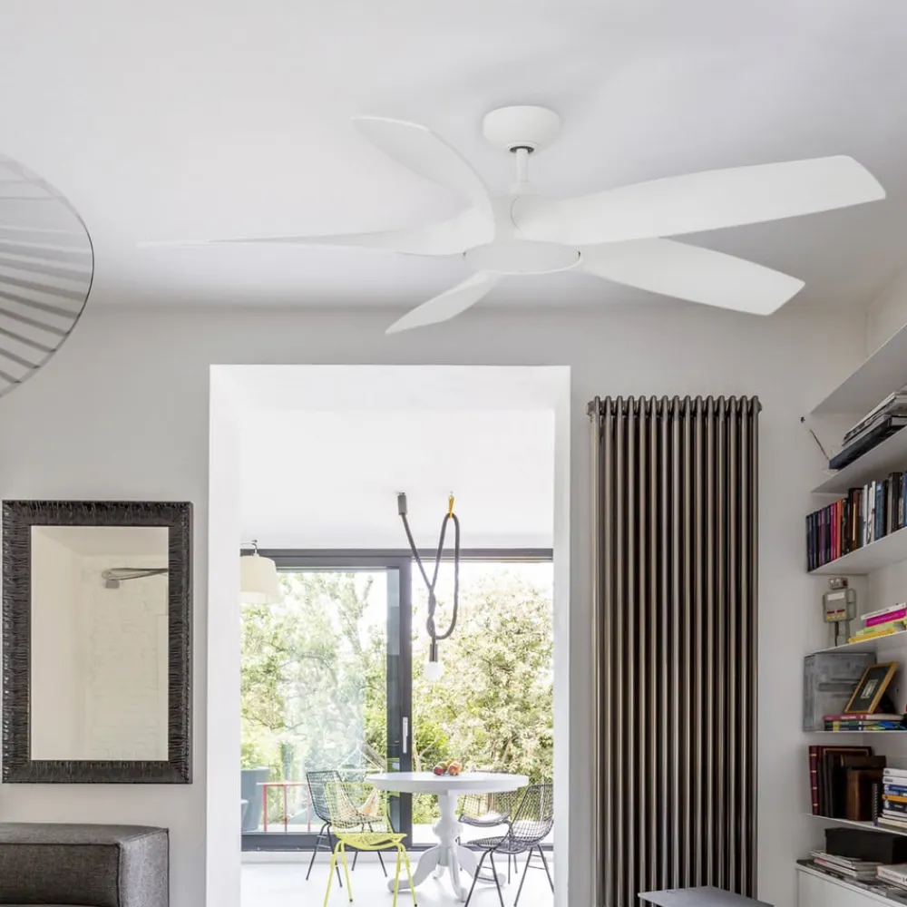 Loftventilator Cocos L med fem blade i hvid med LED-lyskildeLuftforfriskende og samtidig effektiv grundbelysning med atmosfærisk karakter, det er hvad den moderne loftventilator Cocos L med DC-motor tilbyder i ét produkt. Varmt hvidt LED-lys. Inklusive fjernbetjening (uden batterier: 2 x AAA (LR03) 1,5V).FunktionerKan omskiftes fra sommer- til vinterdrift: Der kan spares varmeudgifter ved at betjene ventilatoren om vinteren, da Cocos L fordeler den opvarmede rumluft jævnt i rummet.Fem wattydelser samt fem hastigheder kan indstilles.Inklusive varmt hvidt lysende LED-lys.Tekniske dataEffekt pr. hastighed:- 7 watt ved 66 omdrejninger pr. minut- 10 watt ved 88 omdrejninger pr. minut- 13 watt ved 104 omdrejninger pr. minut- 17 watt ved 115 omdrejninger pr. minut- 24 watt ved 115 omdrejninger pr. minut- 24 watt ved 115 omdrejninger pr. minut 17 watt ved 115 o/min- 24 watt ved 138 o/min- 29 watt ved 146 o/minLuftgennemstrømning: 234 m³
