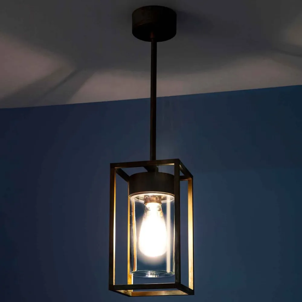 Antikt design Cubic³ 3368 pendel til udendørs brug Det klart strukturerede, kantede design af stellet på Cubic³ 3368 udendørs pendel brydes af det cylindriske messing- og glasarmatur indeni. Takket være det havvandsbestandige design er denne smukke lyskilde også velegnet til bygninger nær kysten. Den endelige finish i antik messing blev påført i hånden. Det resulterer i små variationer i farvetonen mellem de enkelte dele, hvilket gør hvert armatur unikt.