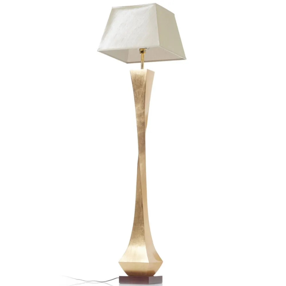 Fornem og rigt udsmykket virker gulvlampen Deco, som ikke bare gør indtryk med sin form og konstruktion, men også med kombinationen af materialerne, træ, metal og silke. På den kvadratiske fod af valnøddetræ er gulvlampens stel af metal med guldfoliefinish blevet anbragt. Det rager opad med sin kantede, snoede form og bærer den kantede, beigefarvede silkeskærm. Gulvlampen Deco er udstyret med en E27-fatning, hvor der er bare kan isættes traditionelle glødepærer op til 60 W, men også moderne LED-pærer eller energisparepærer.