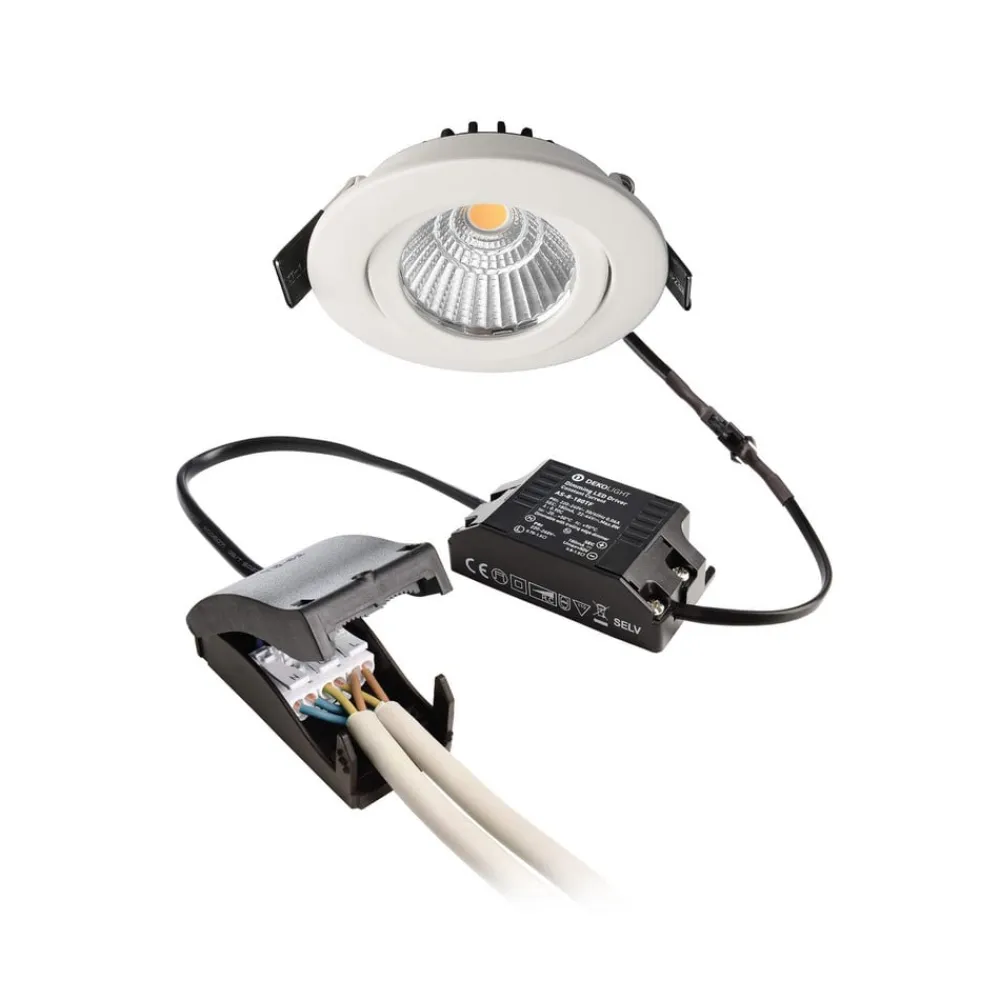 Dione indbygget loftlampe med LED med dæmpbar funktion Dione indbygget loftlampe med LED imponerer med sin særligt lave installationsdybde. Det gør den meget pladsbesparende og kræver kun et hulrum i loftet på 25 mm. Tilslutningsboksen og den dæmpbare strømforsyning, der er inkluderet i leveringsomfanget, passer også ind i den 68 mm store udskæring takket være det kompakte design. Da alle komponenter er formonteret til brug, er der mulighed for tidsbesparende installation uden brug af værktøj. Tilslutningsboksen med plug-in-terminaler muliggør også 3-polet gennemfortrådning. Det gør indbygningslampen til den ideelle løsning til eftermontering i et renoveringsprojekt eller til nye installationer med begrænset installationsplads. COB-teknologien af høj kvalitet gør det muligt for indbygningslampen at levere et højt, effektivt output. Huset er lavet af aluminium, strålevinklen er 36°, og lampehovedet kan vippes op til 30° – Lys- og strømforsyningsenhed med adapterstik – Dæmpbar til varm (3.000 K / 1.800 K) – Stænktæt, IP44 – Mulighed for gennemfortrådning – Inkl. dæmpbar strømforsyningsenhed (via forkantstyret dæmper og bagkantstyret dæmper) og tilslutningsboks Tilslutningsboksen leveres med 2 skruer i forskellige længder, kort skrue ved brug af tynde kabler, lang skrue ved brug af installationskabler NYM 3×1,5 etc. – dæmpbar strømforsyningsenhed (via forkantstyret dæmper og bagkantstyret dæmper) og tilslutningsboks.