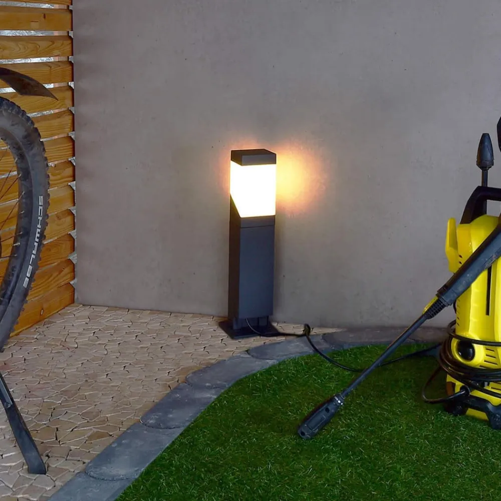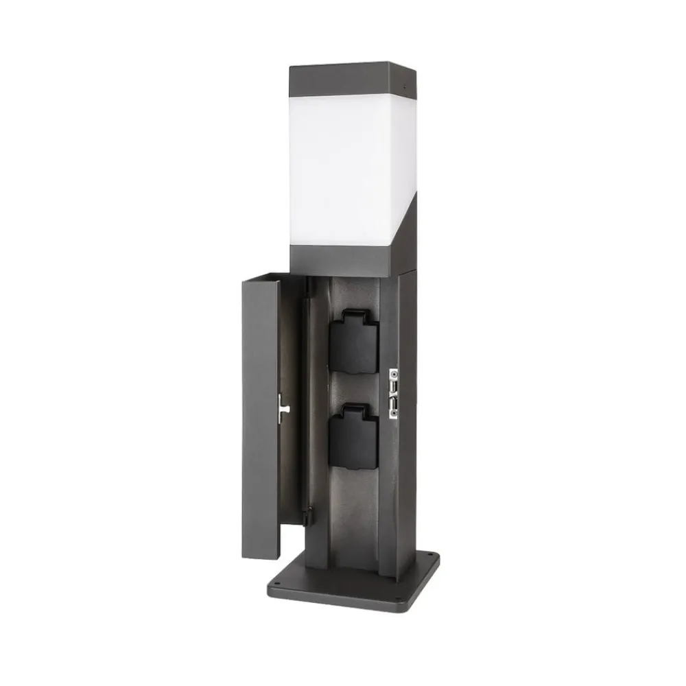 Den rektangulære Kukui Puka-sokkel er fremstillet af mørkegråt trykstøbt aluminium, hvilket gør søjlen tidløs og stilfuld. Kukui Puka er udstyret med to fatninger og har en E27 fatning i det øverste område bag opal plast. Beskyttelsesgraden IP54 sikrer en uproblematisk strømforsyning udendørs til f.eks. haveredskaber. Dækslet kan lukkes helt, når de vinklede propper er sat i. De to sokler kan belastes med maksimalt 3 650 W.