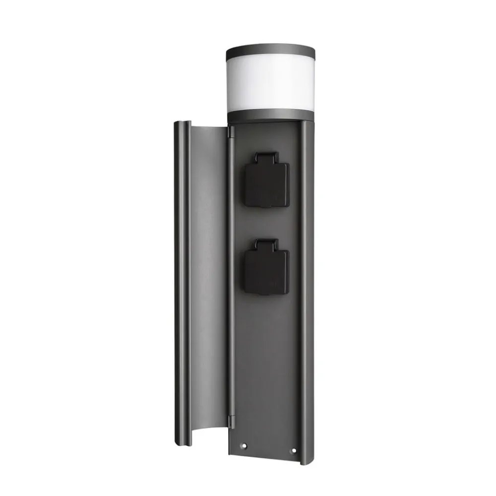 Denne belyste stikkelsøjle har integrerede LED’er og imponerer med sit moderne design. Den har en elegant mørkegrå finish og er fremstillet af støbt aluminium. De to stikkontakter giver en maksimal effekt på 3.650 watt, og takket være IP44 er den alsidig til udendørs brug. Fatningslampen lyser i et behageligt varmt hvidt lys og oplyser hele vejen rundt.