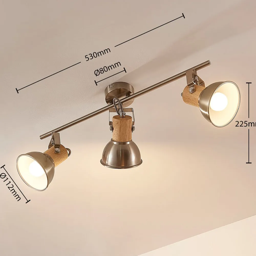 Smukt design af nikkelfarvet metal og træ: Dennis loftslampenDenne loftslampe er en smuk all-rounder til stuen, der kombinerer et køligt udtryk med et varmt touch, hvilket skyldes, at nikkelfarvet metal er kombineret med træelementer. Hver af de tre skærme kan flyttes efter ønske, da leddene gør det muligt at dreje og dreje den for bedre at ændre lysets retning.