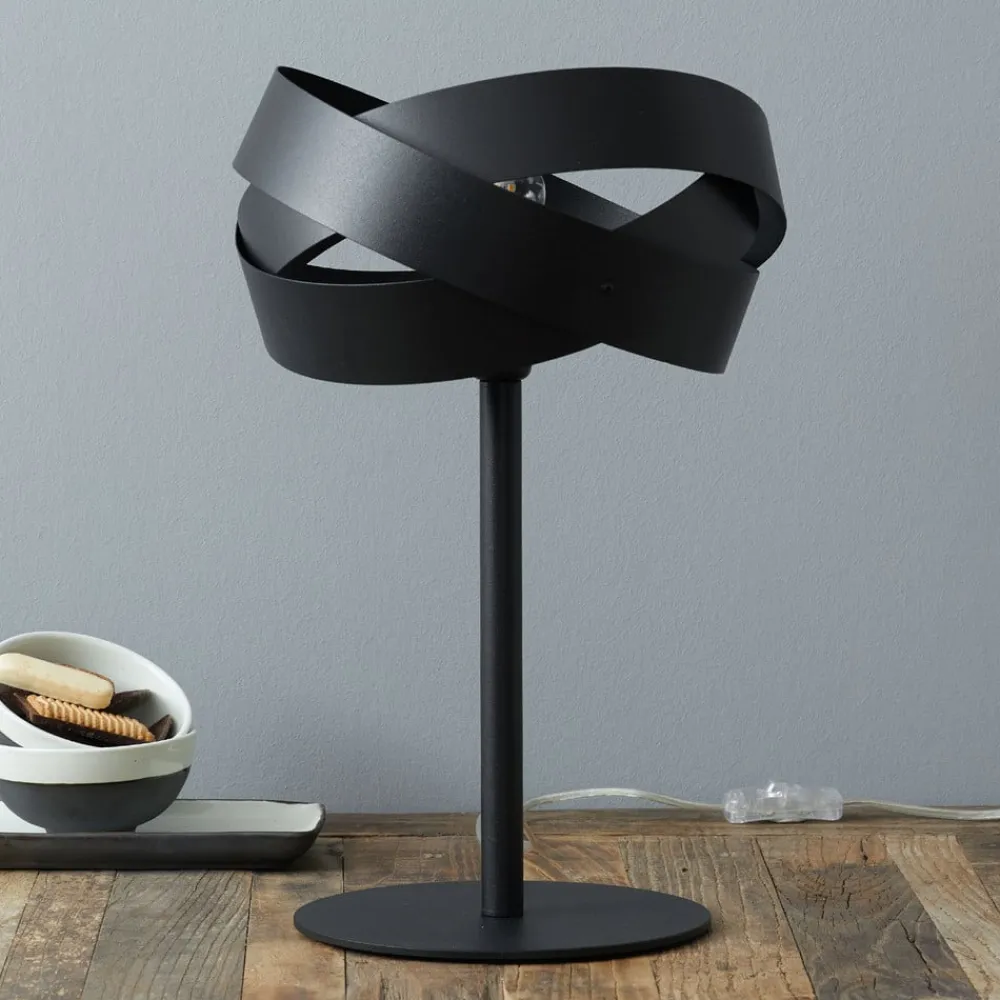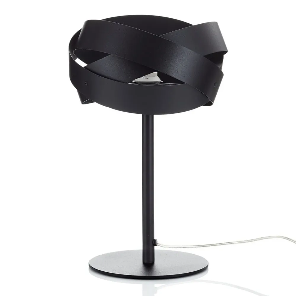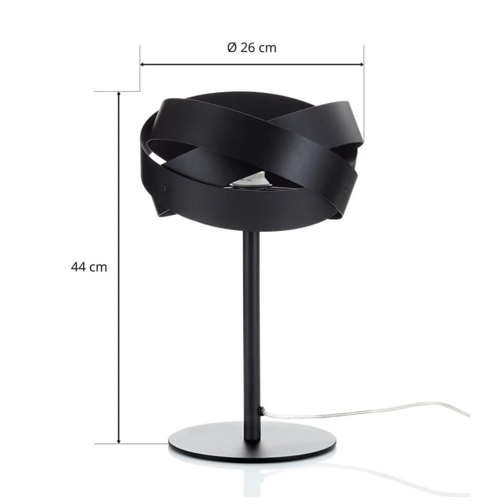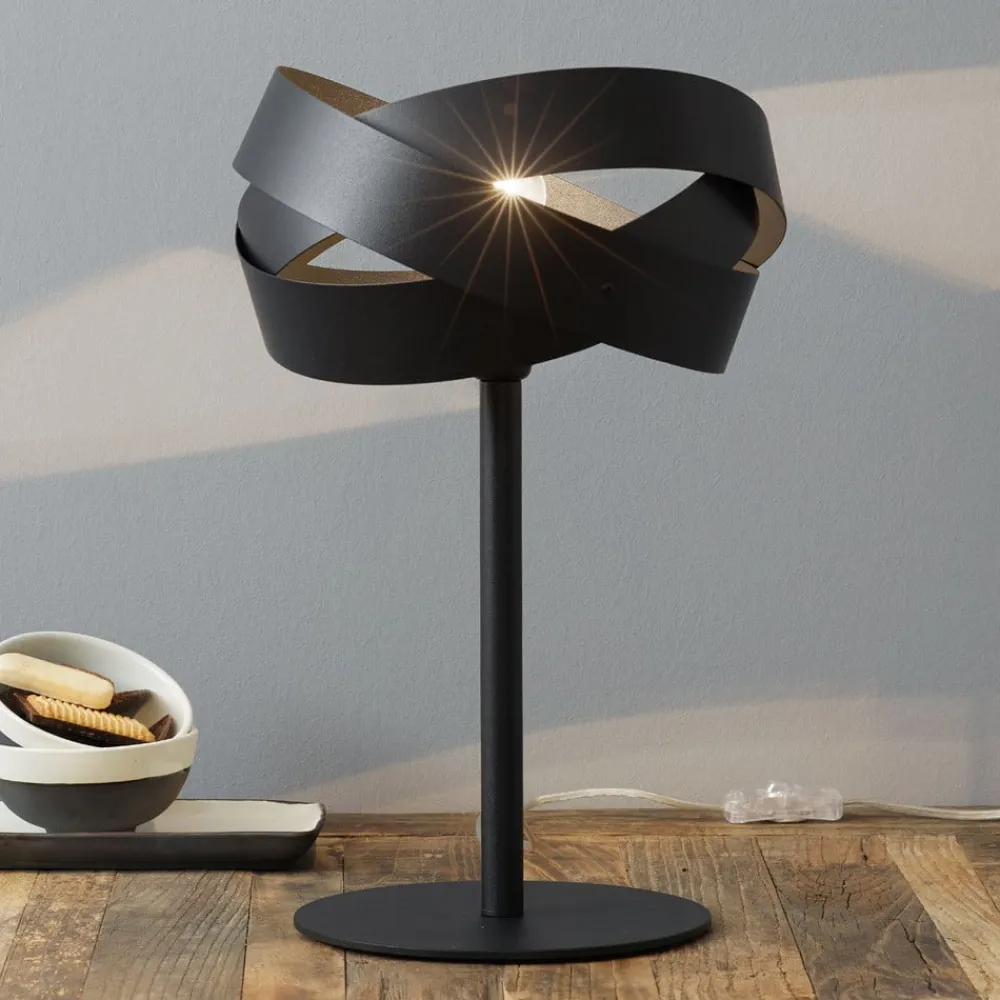 Med bordlampen Tornado flytter der en meget stemningsfuld lysgiver ind i boligen, som også dekorativt har noget at byde på. Lyset skabes af en E14-pære, der er placeret i et virvar af metalstrimler, og det slipper kun ud foroven og forneden og gennem de små slidser mellem metalstrimlerne. Det omliggende område bliver på den måde oplyst på en meget behagelig måde. Lampen betjenes bekvemt med en vippekontakt på ledningen.