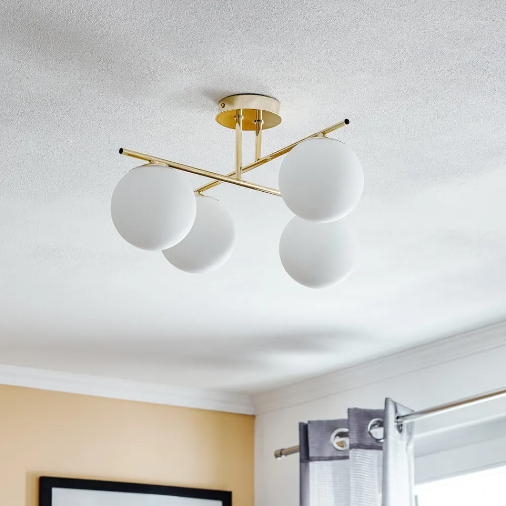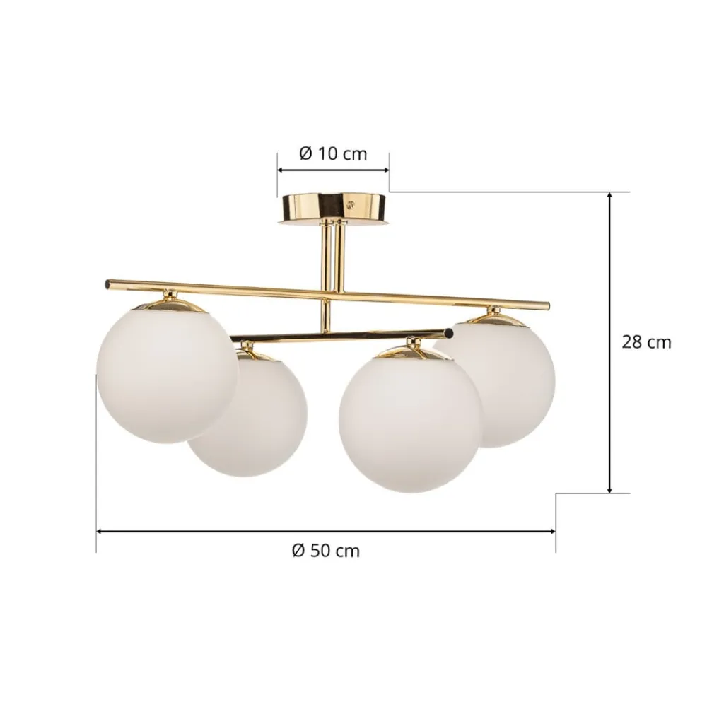 Loftlampen Aurora forener tidløs elegance med funktionel alsidighed. Den er fremstillet af højkvalitetsstål og glas og stråler i en elegant guldfarve, der giver ethvert rum et luksuriøst præg. Med en diameter på 50 cm og 4 lyskilder med E14-fatninger sikrer den en jævn og behagelig belysning i stuer og soveværelser samt i entreen og spisestuen. Muligheden for dæmpning via en ekstern lysdæmper gør det muligt at tilpasse lysintensiteten fleksibelt for at skabe den ønskede atmosfære.