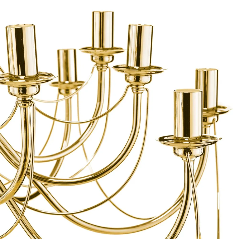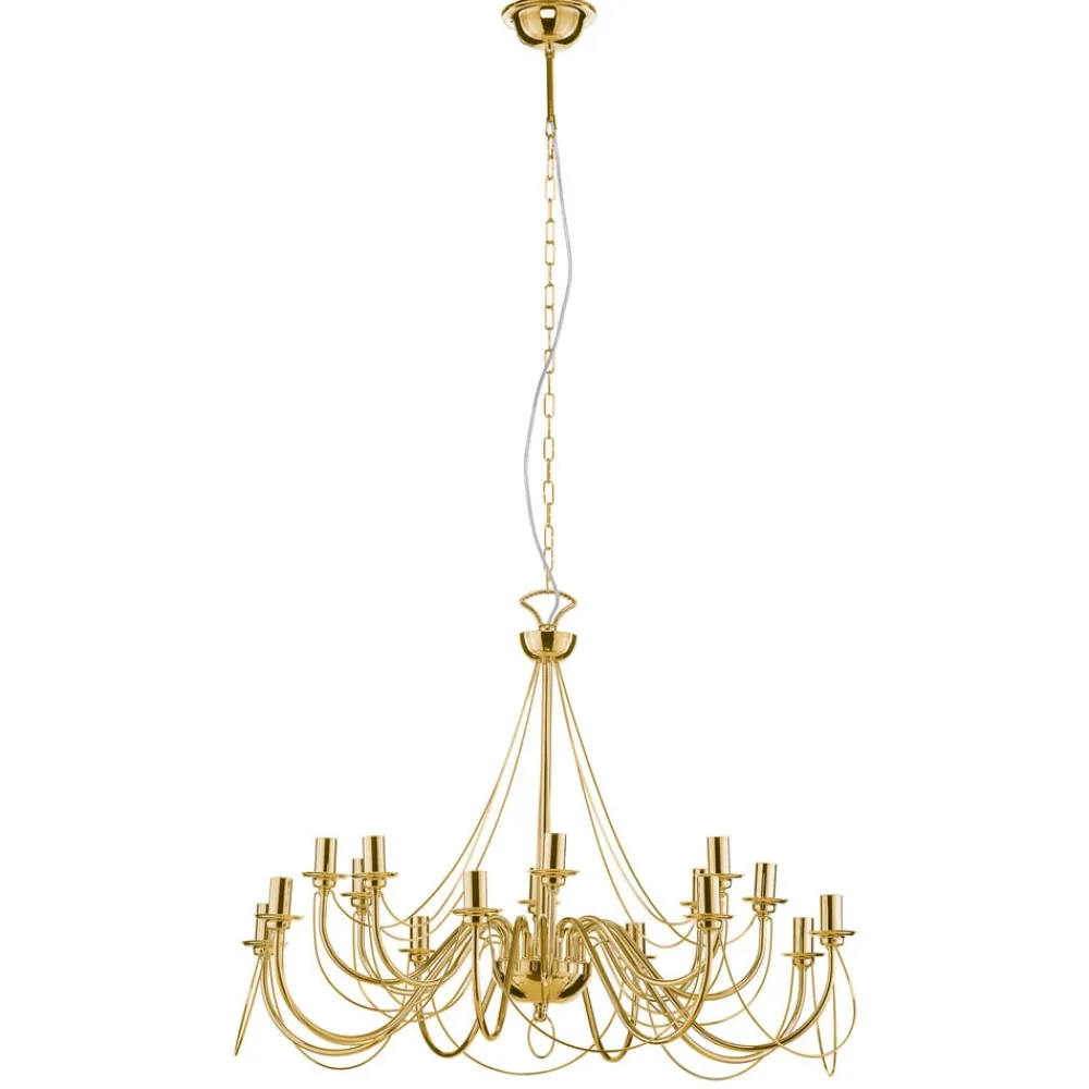 Lysekrone Retro, 16-flammet, i elegant guld, forener klassisk elegance med moderne alsidighed. Fremstillet af højkvalitetsstål, tilbyder denne lysekrone ikke kun et imponerende udseende, men også en langtidsholdbar og robust konstruktion. Den gyldne farve giver ethvert rum en varm og luksuriøs atmosfære, der kommer perfekt til sin ret i både stuen og spisestuen.