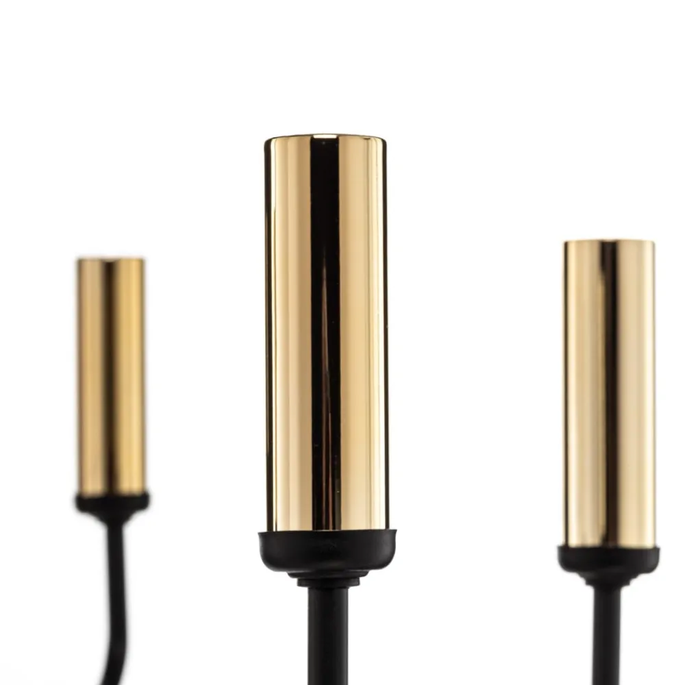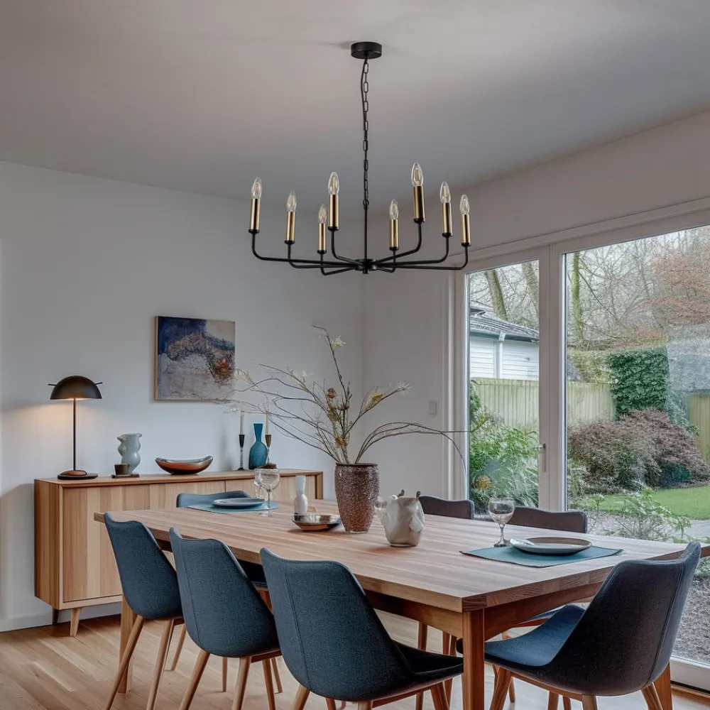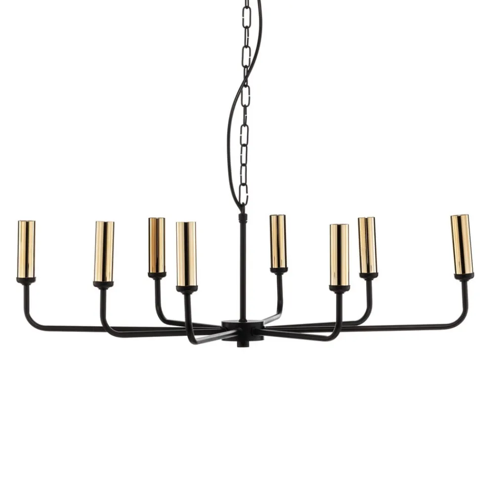 Lysekrone Ampli i sort og guld kombinerer moderne design med højkvalitets stål. Med sine otte lysarme sætter den stilfulde accenter i ethvert rum, hvad enten det er i stuen, køkkenet eller spisestuen. Kombinationen af sort og guldfinish giver lysekronen en tidløs elegance, der harmonerer med forskellige indretningsstilarter.
