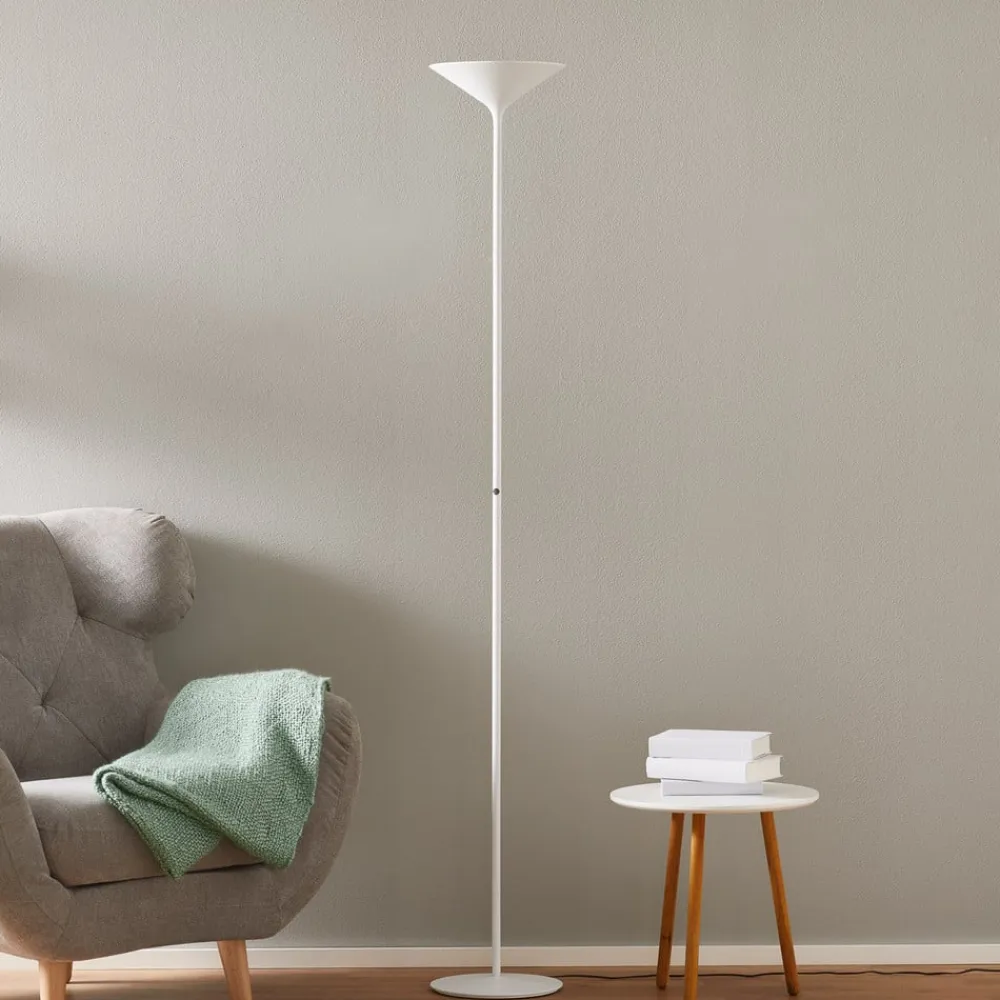 Gulvlampen har et moderne og rent look, og kan desuden bryste sig af moderne, tekniske egenskaber. Kontakten er integreret i stangen. De lysstærke LED’er byder på den passende grundbelysning til store, moderne opholdsrum via belysning af loftet, mens dæmperfunktionen, der styres via kontakten, også gør det muligt at bruge lampen i en privat bolig.