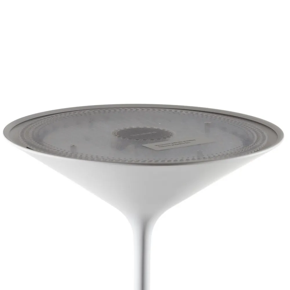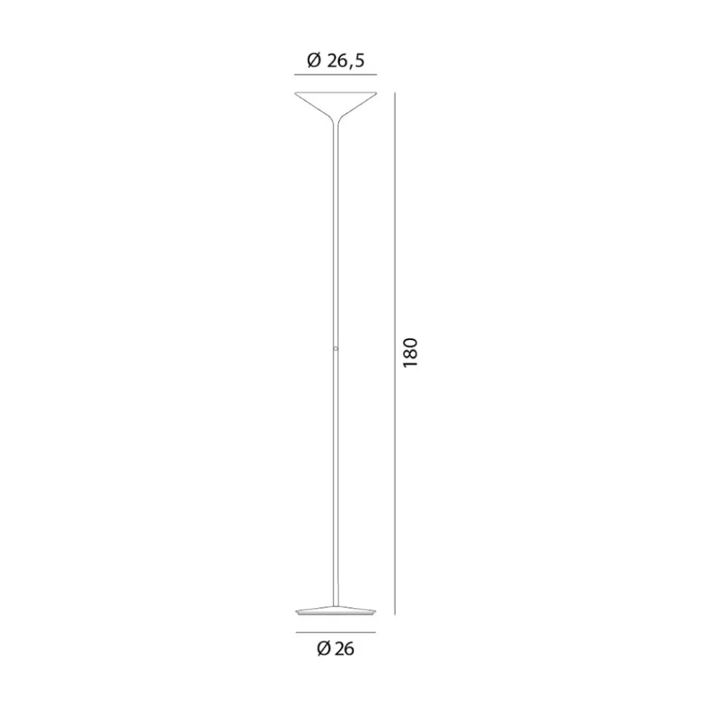 Designerne Giovanni Lauda og Dante Donegani blev inspireret af et cocktailglas til designet af gulvlampen Dry. Ud fra den skiveformede fod rager en lang, rund stang i stil med glasset, der går ubesværet over i den tragtformede skærm, som åbner opad.