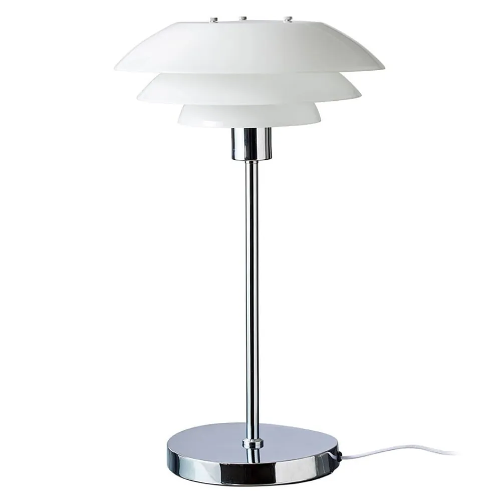 DL31-bordlampen er et ikon i rummet takket være dens skærmdesign. Skærmen består af tre opalhvide glaselementer i forskellige størrelser og tillader lyset fra den anvendte pære (medfølger ikke) at stråle ikke kun direkte nedad, men også blødgjort gennem glasset og mellemrummene til siderne. Den opalhvide glasskærm sidder på en blank forkromet, enkel metalramme med en rund fod. Denne kombination gør bordlampen velegnet til både moderne og klassiske miljøer, og den kan endda bruges i en minimalistisk stil.