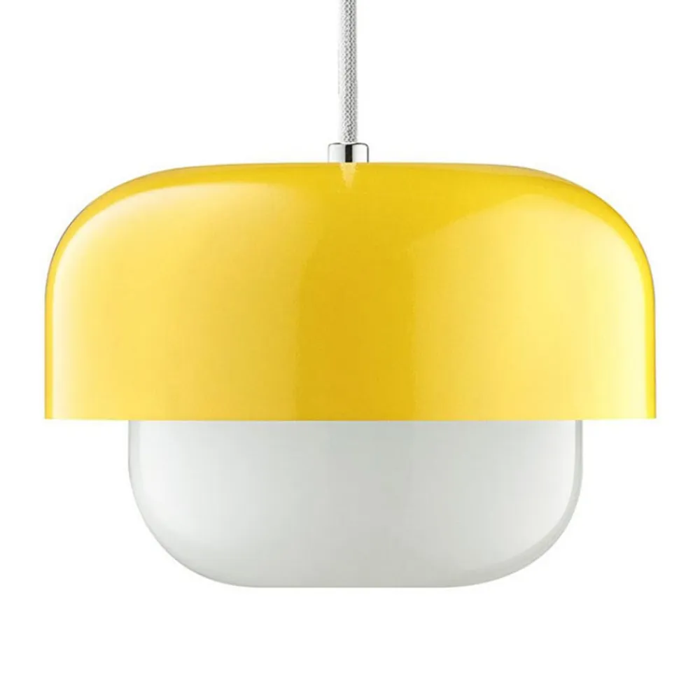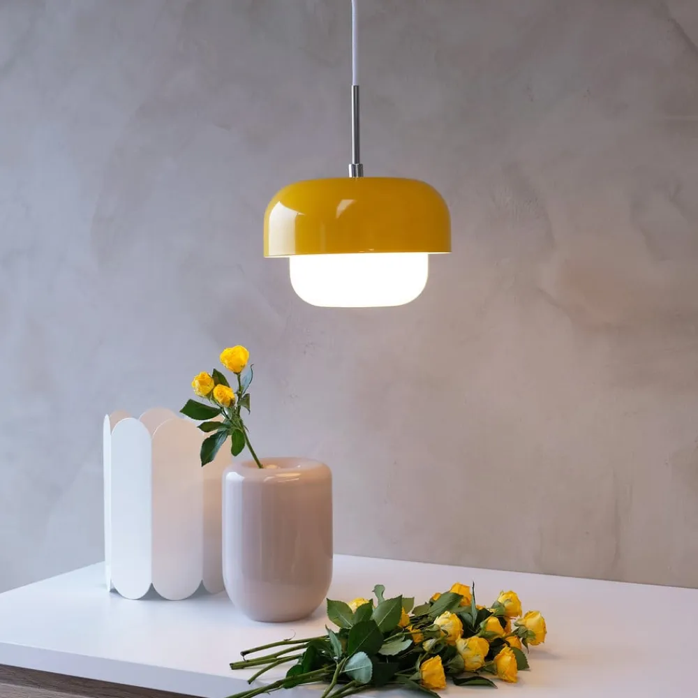 Hængelampe Haipot – en smuk kombination af metal og glas Enkeltstående eller flere i række eller i klynger er den lille hængelampe perfekt til belysning af borde eller diske. Loftsrosetten er lakeret, så den passer til skærmens metalfarve.