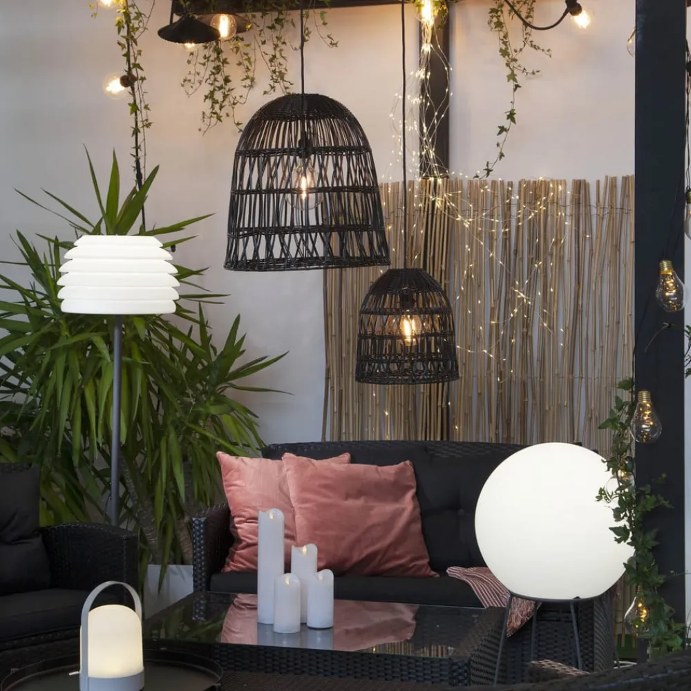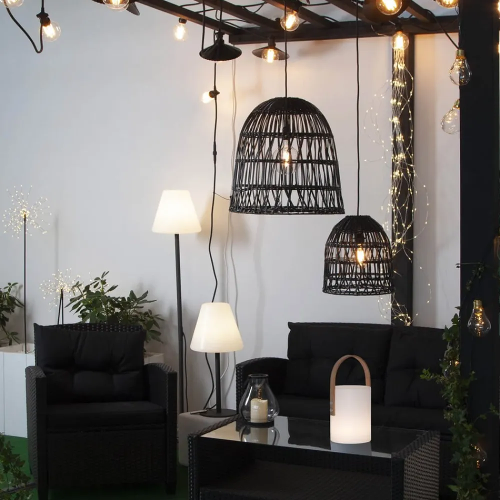 Dekorativt kabel med E27-fatning Ute E27-fatningen Ute er udstyret med et langt kabel. Et Schuko-stik er fastgjort til enden af kablet. På grund af længden er kablet ideelt til dekorative formål og som pendel til udendørs brug – Pærer medfølger ikke