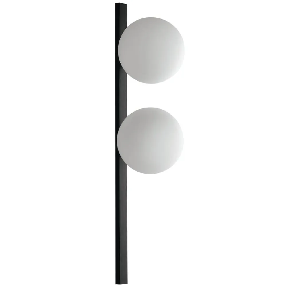 Pluto væglampe med to opale kugleskærme og sort vægbeslag Med et tiltalende samspil af kontraster og et klart designsprog er den 2 lyskilder store Pluto væglampe det perfekte indretningselement til moderne interiører – uanset om det er i private opholdsrum eller i et offentligt galleri, for eksempel. Dens skærme er designet som symmetriske, lyse kugler af opalglas, som giver en ensartet lysfordeling hele vejen rundt. Vægbeslaget i aluminium er derimod formet som et langt, sort rektangel; skærmene er fordelt asymmetrisk på det, så et område af beslaget forbliver helt frit.
