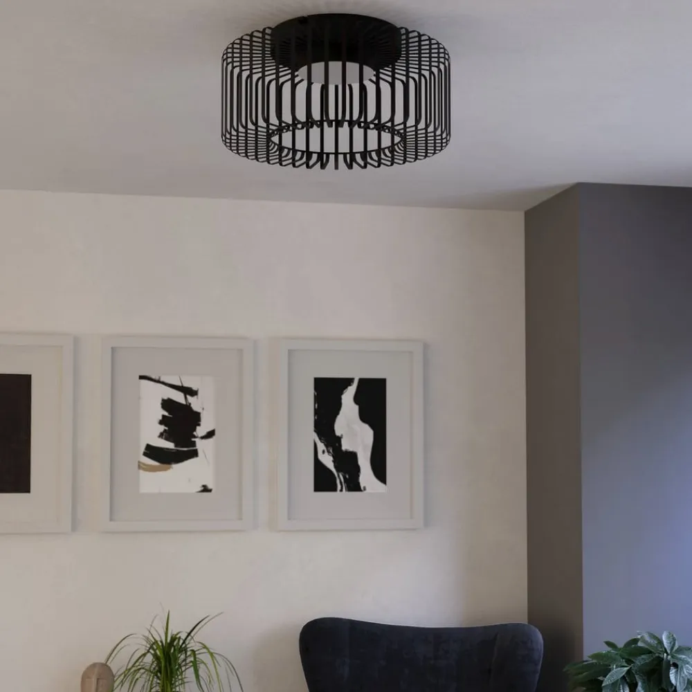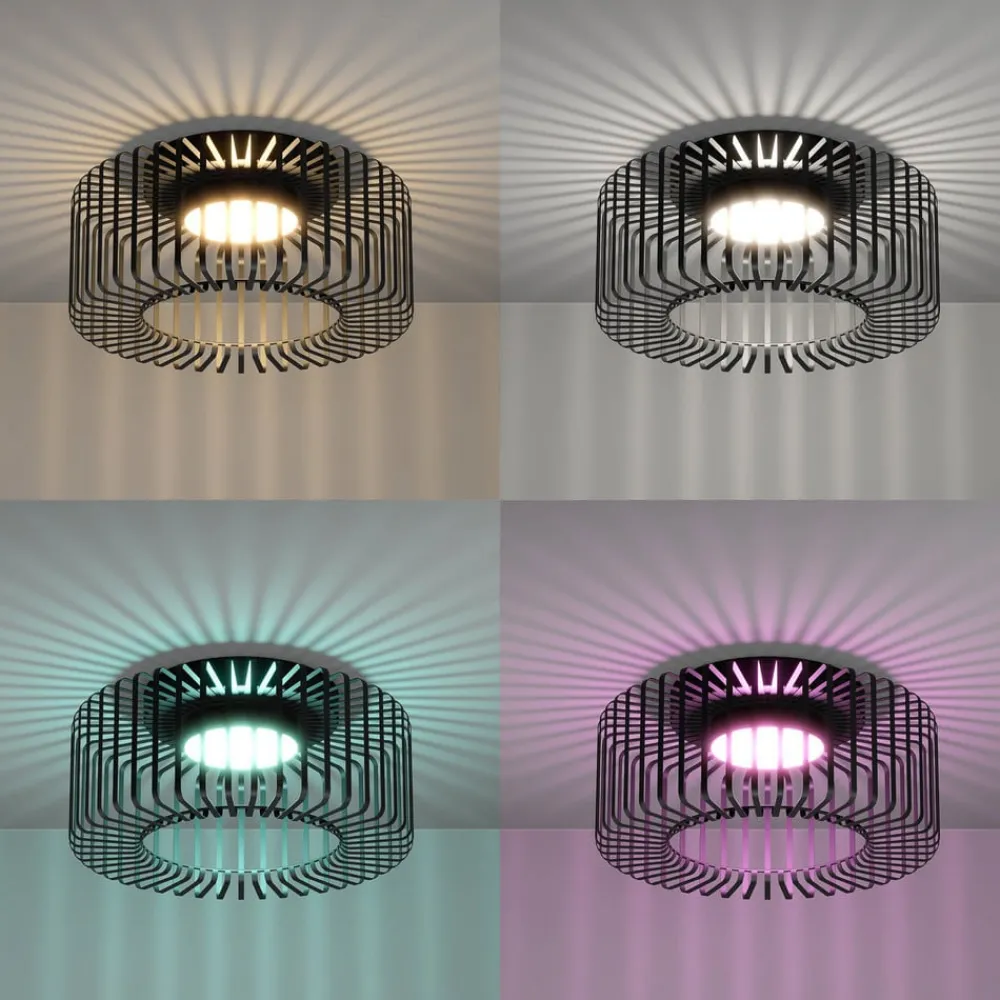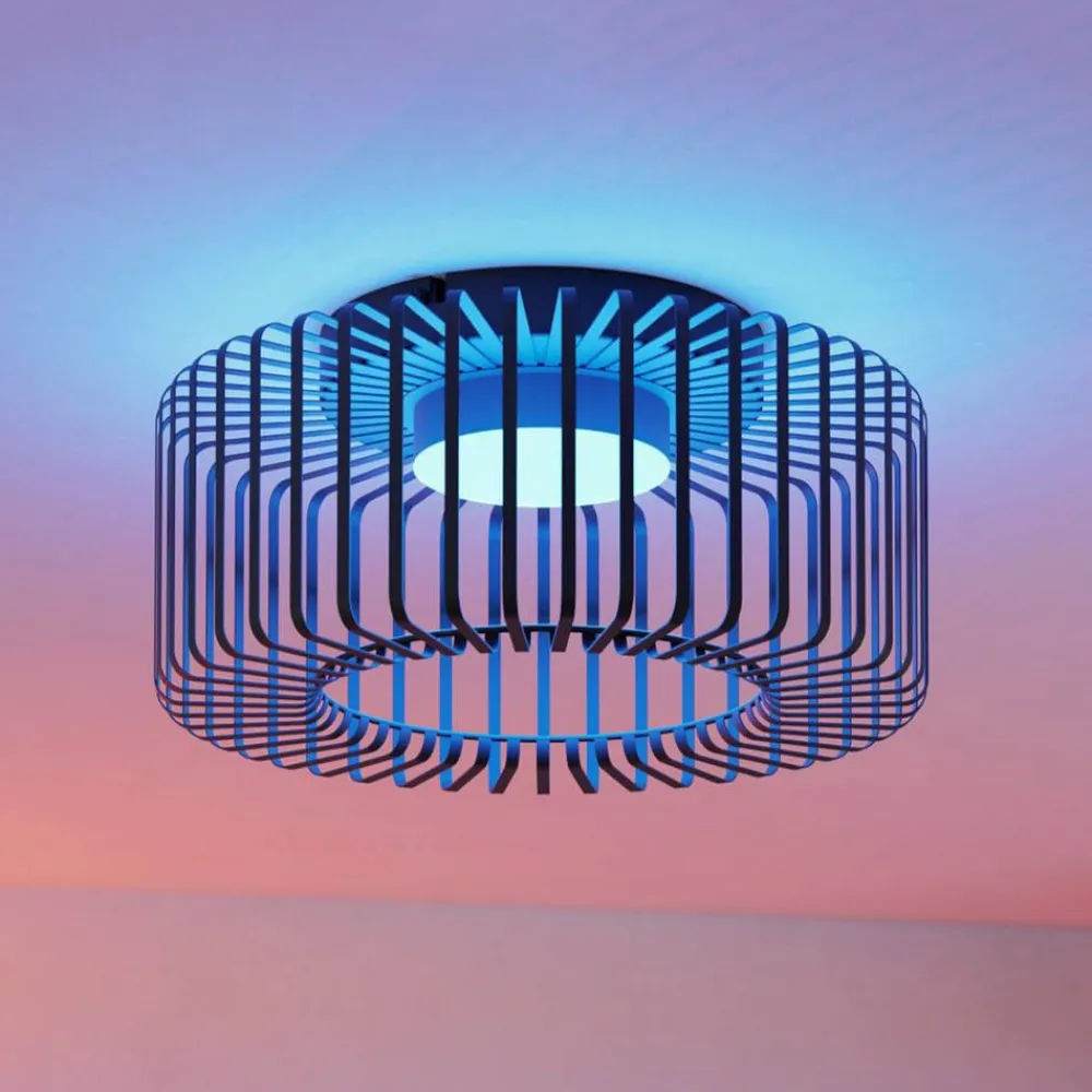 Ginestrone-Z LED-loftlampe, EGLO connect, CCT, RGB Ginestrone-Z LED-loftlampen fra connect.z smart home-serien har en rund lampeskærm lavet af sorte, flade metalstrimler med en indvendig LED-profil bag hvid plast. Metalstrimlerne skaber et fascinerende samspil mellem lys og skygge, så snart lyset tændes. De integrerede LED’er giver et behageligt lys efter ønske. Du kan vælge mellem varmhvidt, universalhvidt og køligt hvidt lys og en række RGB-lysfarver. Lyset styres via en gratis app (AwoX Home Control) og giver adgang til andre praktiske funktioner som dæmper, timer, tilstedeværelsessimulering og mange flere. Loftlampen styres via Bluetooth og ZigBee 3.0 og kan også styres via kompatible stemmeassistenter. Som et alternativ til styring via app kan den smarte loftlampe også styres ved hjælp af en separat tilgængelig fjernbetjening. Den sorte lampe passer problemfrit ind i moderne interiør. Den tilbyder et moderne design til alle rum – uanset om det er køkken, stue, soveværelse eller gang.