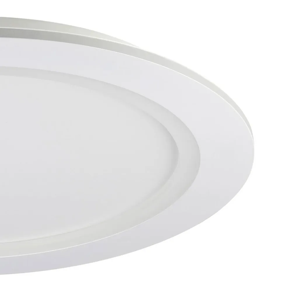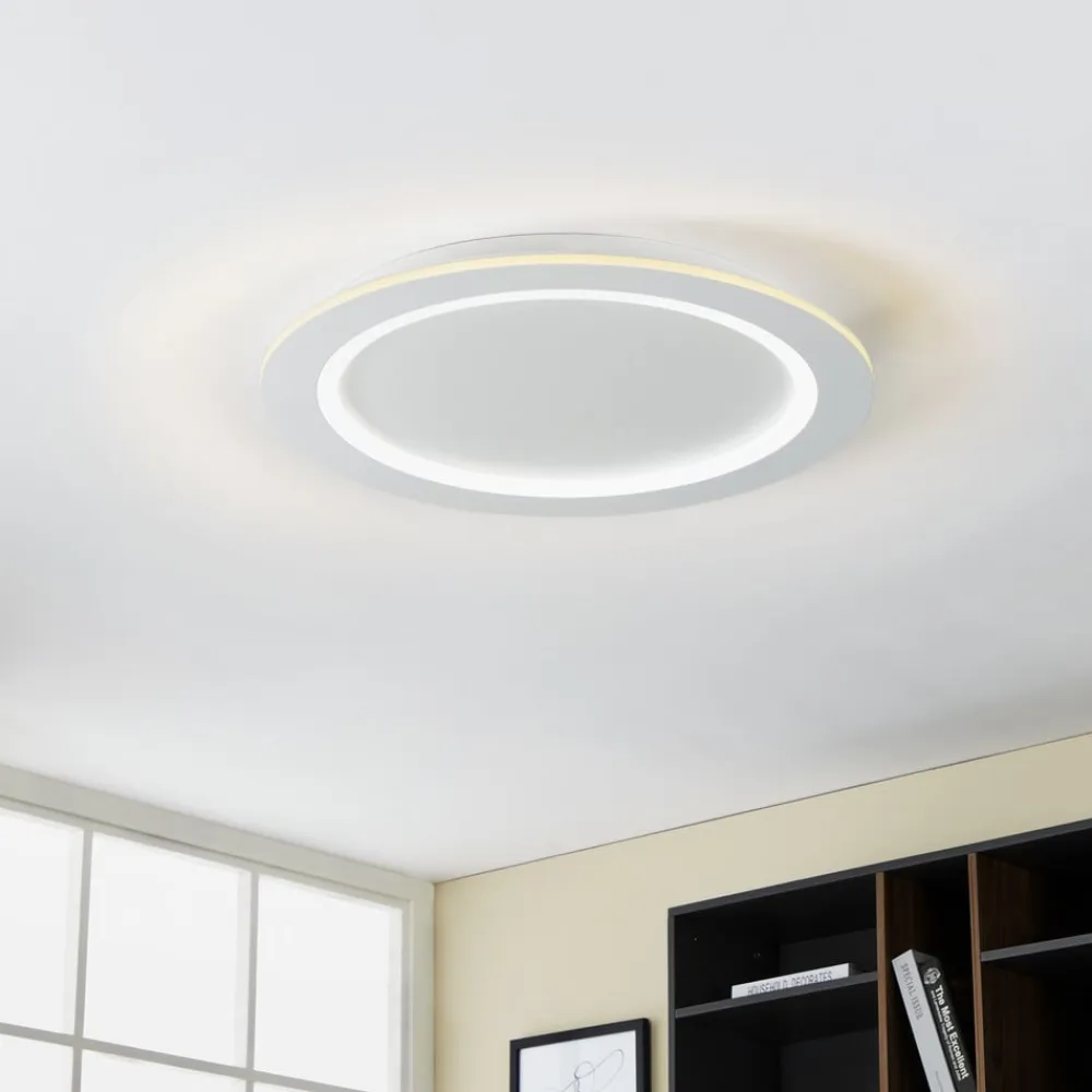 LED-loftlampe Padrogiano-Z EGLO Connect, Ø 60 cm, rund Den store LED-loftlampe Padrogiano-Z fra connect.Z smart home-serien fra EGLO er lavet af hvidt metal og en plastring på toppen. De integrerede LED’er giver et behageligt lys efter ønske, for takket være RGB- og farveskift kan der vælges både hvidt lys i området fra varmhvid til dagslys (indre ring) og farvet belysning fra en række klare farver (ydre ring). Både den ydre og den indre akrylring kan tændes og slukkes og dæmpes separat. Loftlampen styres via en gratis app (AwoX Home Control) og giver adgang til yderligere praktiske funktioner som f.eks. dæmpning, timer, tilstedeværelsessimulering og meget mere. LED-panelet styres via Bluetooth og ZigBee 3.0 og kan også styres via kompatible stemmeassistenter. Alternativt kan den smarte loftlampe også styres ved hjælp af en separat tilgængelig fjernbetjening. Den runde lampe passer ind i mange indretningsstile og giver variabel, stemningsfuld belysning til ethvert rum og enhver situation.