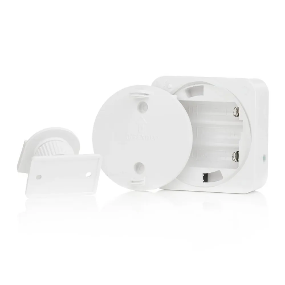 Sensoren leveres med monteringsbeslag og batterier. Det kan fastgøres enten direkte på væggen eller med beslaget, hvilket giver finjustering på 30 grader til venstre eller højre.