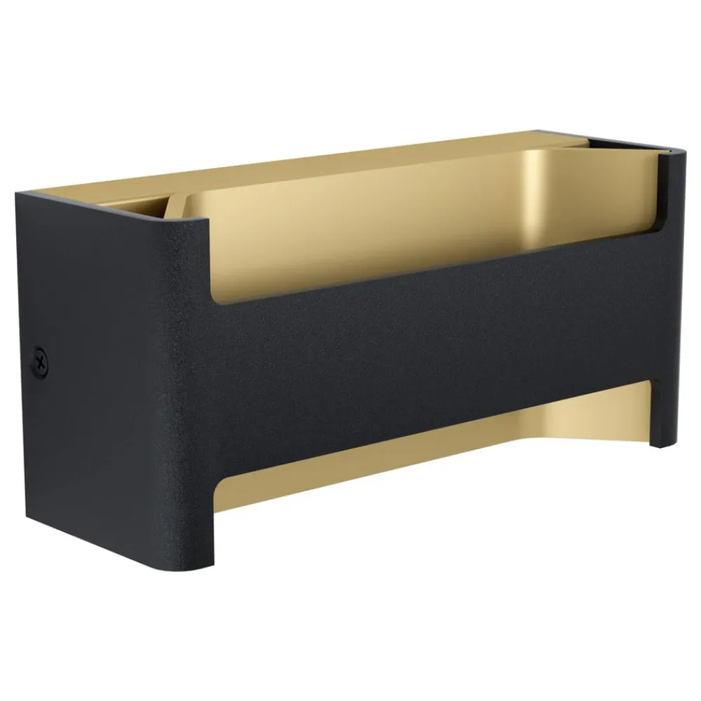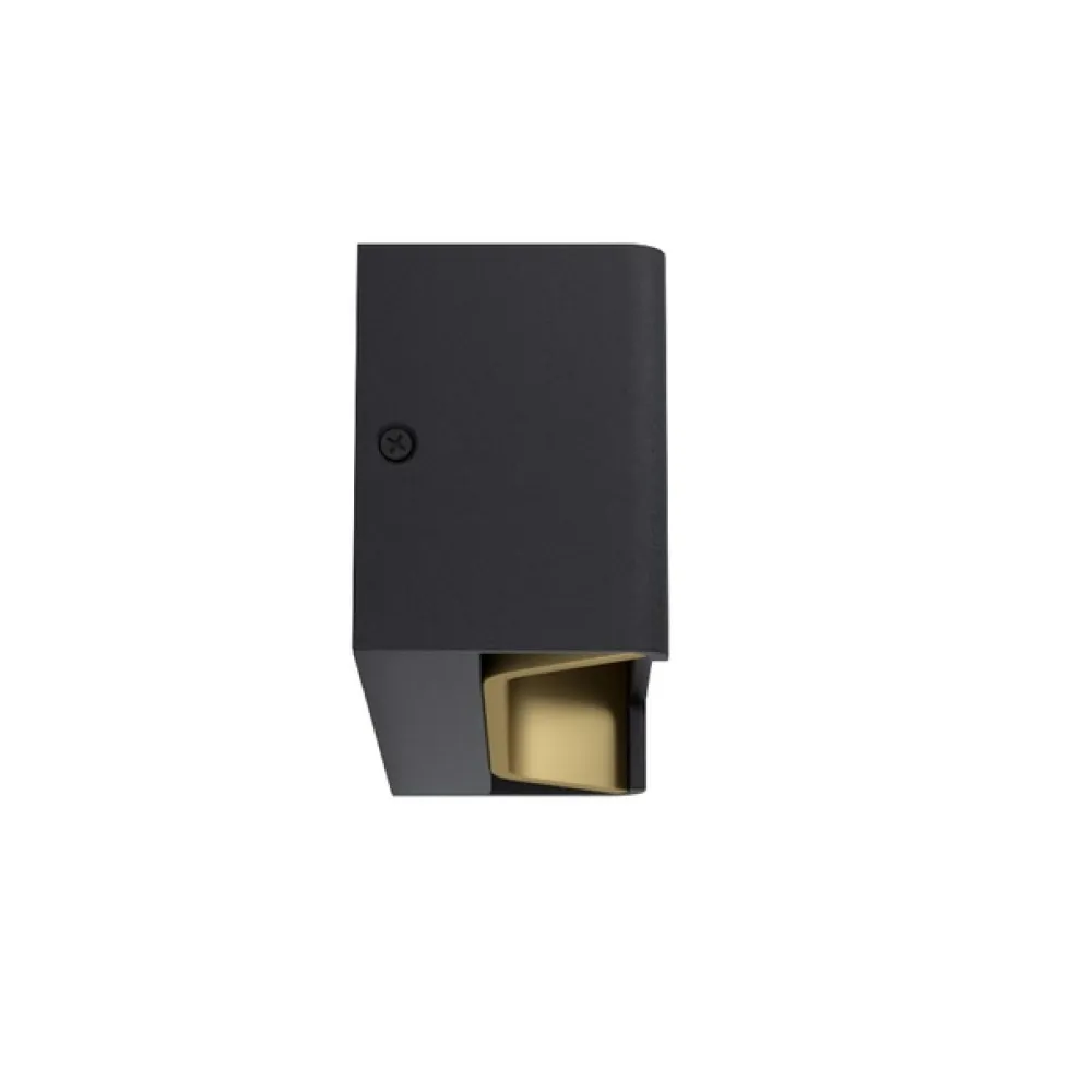 Væglampen i aluminium og gennemsigtig plast fastgøres direkte på væggen. Det kuboidformede aluminiumshus holdes i tidløst sort udvendigt og huser et dynamisk formet og guldraffineret interiør. Med den rigtige lyskilde udsender dette et behageligt lys, der supplerer levende miljø harmonisk.