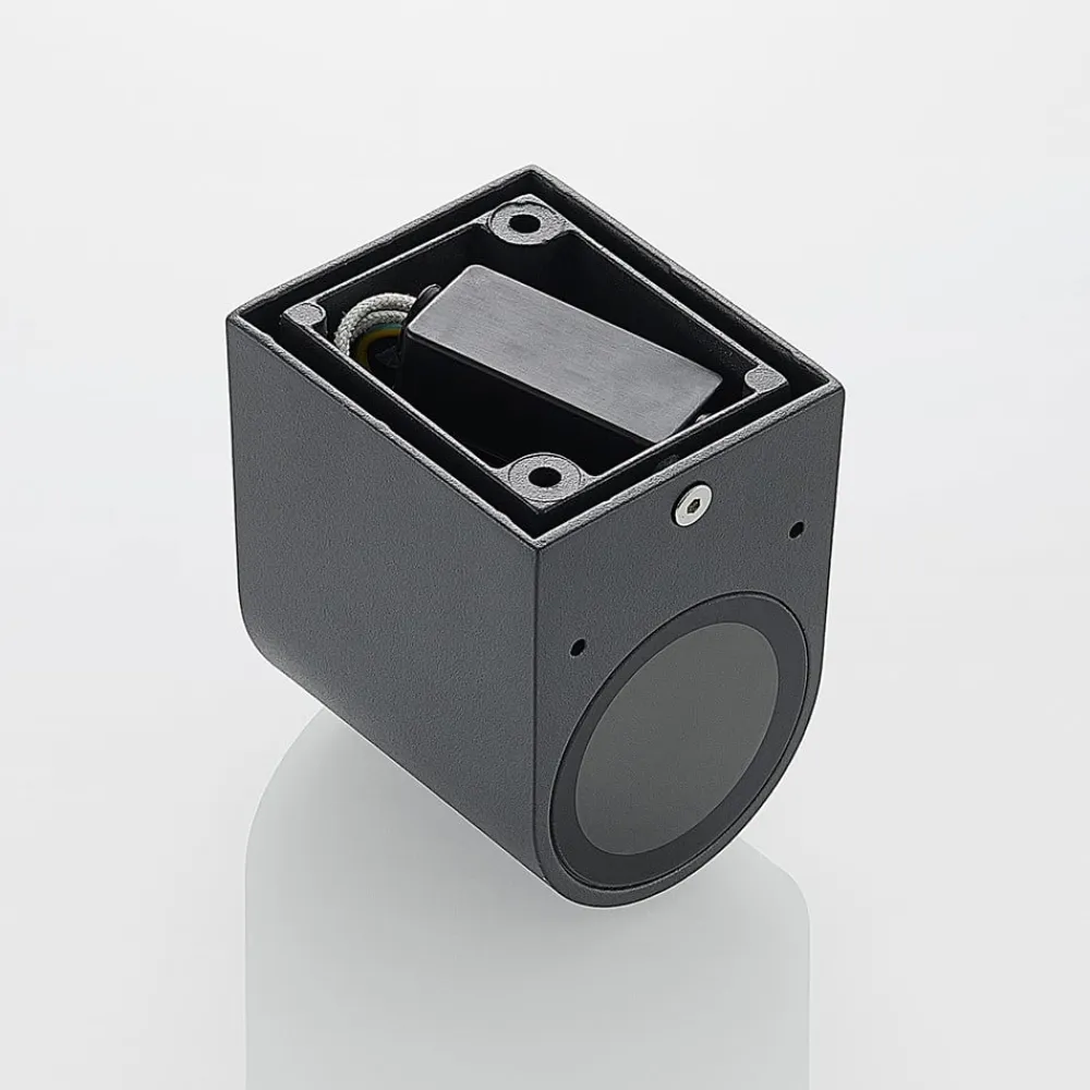 Mørkegrå udendørs væglampe Fijona i halvrund form, til GU10, IP44 Fijona er en enkel udendørs væglampe med et tidløst look, der har en halvrund lyskrop af trykstøbt aluminium med en mørkegrå finish, der passer rigtig godt ind i mange omgivelser. Du kan skabe et smart lyspunkt til orientering på husets facade, så du kan gå sikkert rundt i huset og haven, selv når mørket allerede er faldet på.