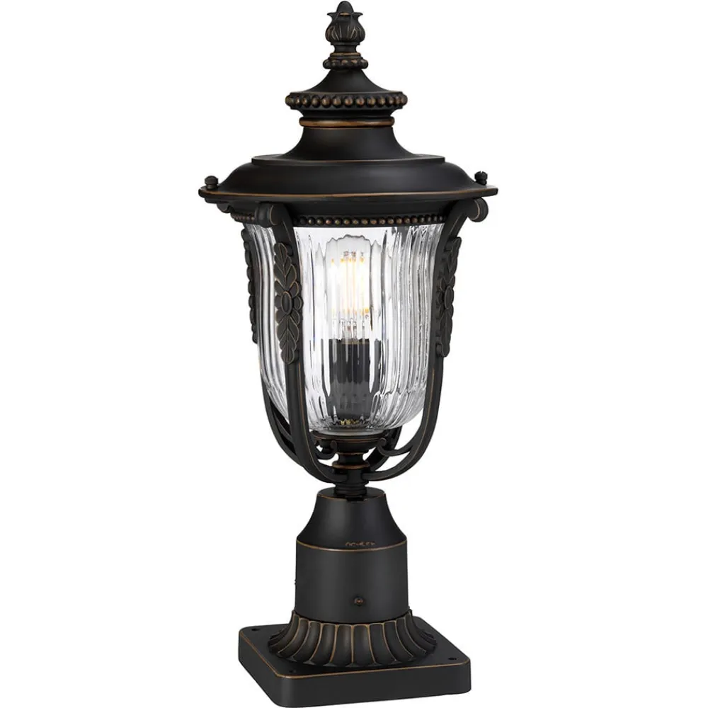 Vægfremspring, Beetabgrenzungen og trapper er optimalt oplyst af det antikke designede sokkellampe Luverne, så de ikke snubler i mørket. De inkorporerede mønstre understreges især af en olie-gnides finish. Det rillede, klare glas giver lyset mulighed for at skinne uhindret i alle retninger og skaber en attraktiv belysningsatmosfære.
