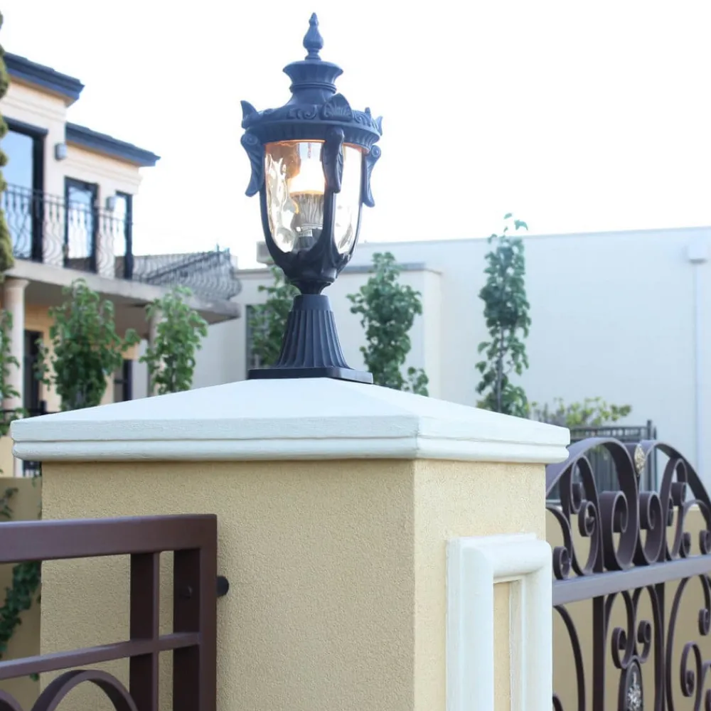 Både farvevalget – antik bronze til stellet og fint rav til glasset – samt formen og ornamenterne minder om gadelamper fra tiden omkring 1900. Med PHILADELPHIA sokkellampen kan man hente denne flair hjem i sin egen have. Bronze-patinaen er påført i hånden.