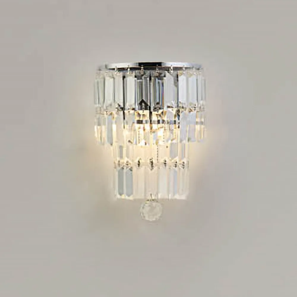 Empire væglampe med kaskader af krystalglas Empire væglampen giver blændende belysning og glamour til ethvert rum, også badeværelser, takket være kapslingsgraden IP44. En skinnende metalramme er udstyret med glitrende, smukt slebne glaspendler arrangeret i en kaskade, der kulminerer i en betagende krystalpendel. De to pærer (medfølger ikke) oplyser krystallerne smukt og skaber et strejf af glamourøs elegance. Dette alsidige møbel vil tilføje et strejf af glans til ethvert soveværelse, stue, spiseplads eller gang.