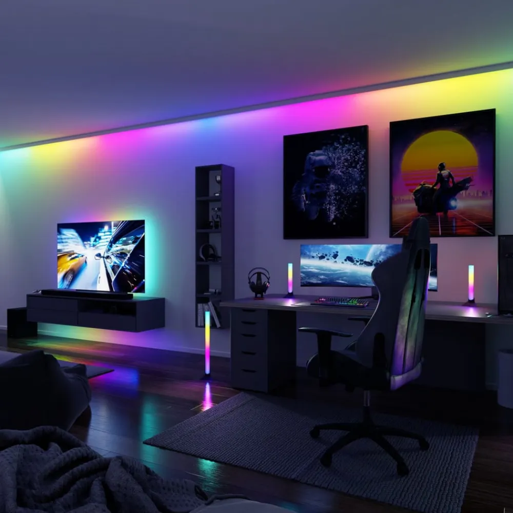 Praktisk dobbeltpakke: EntertainLED Dynamic RGB Lightbars med RGB-farveskift, inkl. fjernbetjening, dæmpbar EntertainLED Dynamic RGB Lightbars fra Paulmann fås her i et sæt med 2 stk. Som indirekte omgivelseslys skaber de effektive lysaccenter med deres behageligt rolige, skiftende, dynamiske farvespil. De elegante aluminiumsprofiler sætter scenen i hjemmets underholdnings- og gamingområder. Den praktiske styring via infrarød fjernbetjening (inkl. 1 x batteri) gør det til en leg at konfigurere utallige brugerdefinerede farvesekvenser og hastigheder.Profilerne leveres klar til tilslutning og er straks klar til brug. De kan placeres vandret på det ønskede sted i rummet, f.eks. ved siden af pc-skærmen eller tv’et. Alternativt kan de fastgøres med selvklæbende velcrobånd eller en skrubar metalclips (inkluderet i leveringen), hvis det er nødvendigt. Derudover kan der fås stativer (se tilbehør), som de dynamiske lysstænger kan placeres lodret med. Alt efter behov kan lysbjælkerne tilsluttes direkte til en USB-port eller betjenes via en stikadapter på en stikkontakt.Tekniske egenskaber- praktisk sæt med 2 RGB-farveskift med forudindstillede, tilpassede lysscener- kan dæmpes trinløst via fjernbetjeningen- hukommelsesfunktionen gemmer det sidst anvendte niveau, indtil næste gang den tændes- inklusive fjernbetjening (med batteri), USB-stikforsyningsenhed, selvklæbende velcrobånd og metalclips til montering