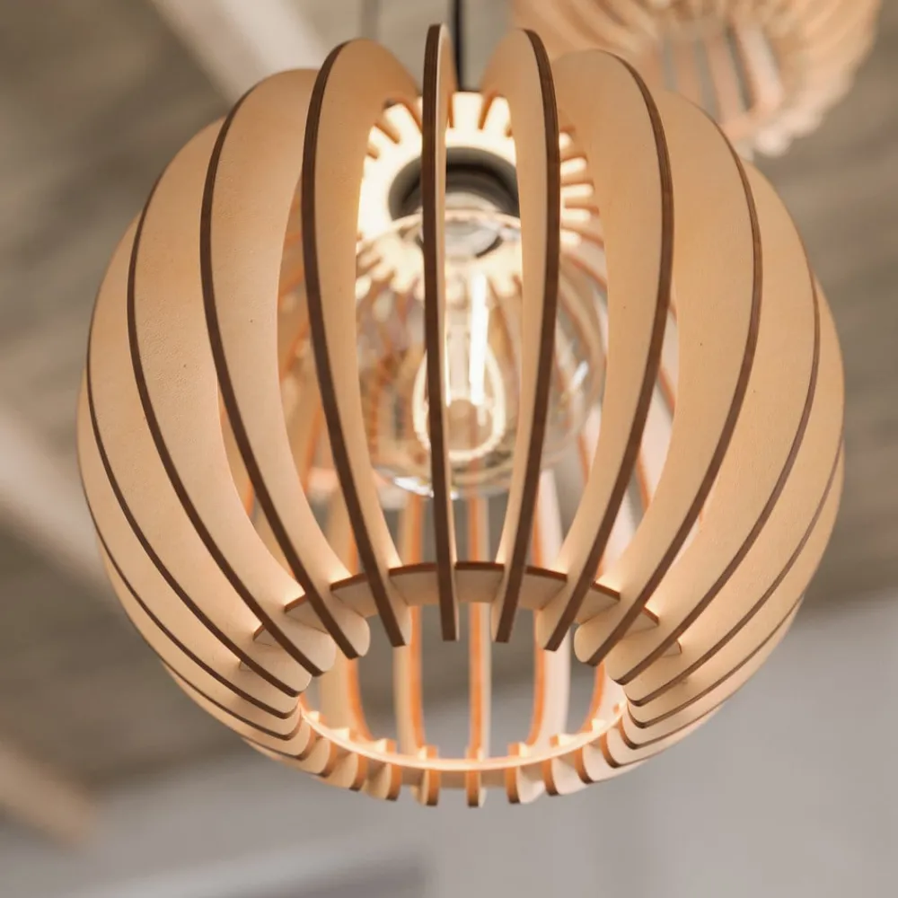 Skærmene består af enkelte træelementer, der er placeret forskudt. De mellemrum, der opstår, giver frit udsyn til lyskilden inde i skærmene. Dekorative pærer er særligt velegnede til belysning (ikke inkluderet). Lyset afgives mod gulvet og til siderne og skaber desuden smukke lys- og skyggeeffekter takket være skærmens design.