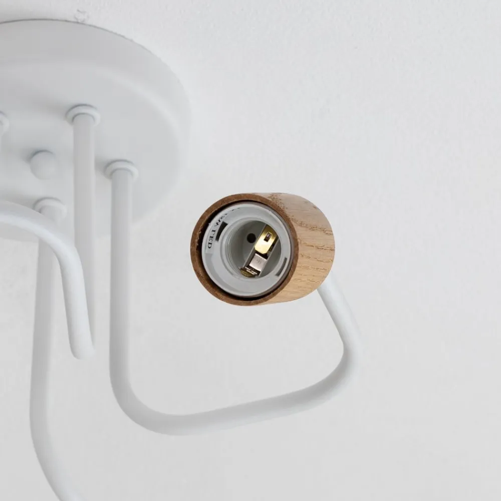 Hvid Joiy-loftslampe med fem spredte fatninger i et træhus – fremstillet i Europa Joiy-loftslampen med fem lys har et moderne og legende look med sine snoede arme af hvidlakeret stål. Disse er orienteret i forskellige retninger og holder hver en lampefatning med et lyst egetræshus, hvilket giver Joiy-loftslampen et naturligt præg. Designet uden skærme kan med fordel suppleres med dekorative glødelamper.