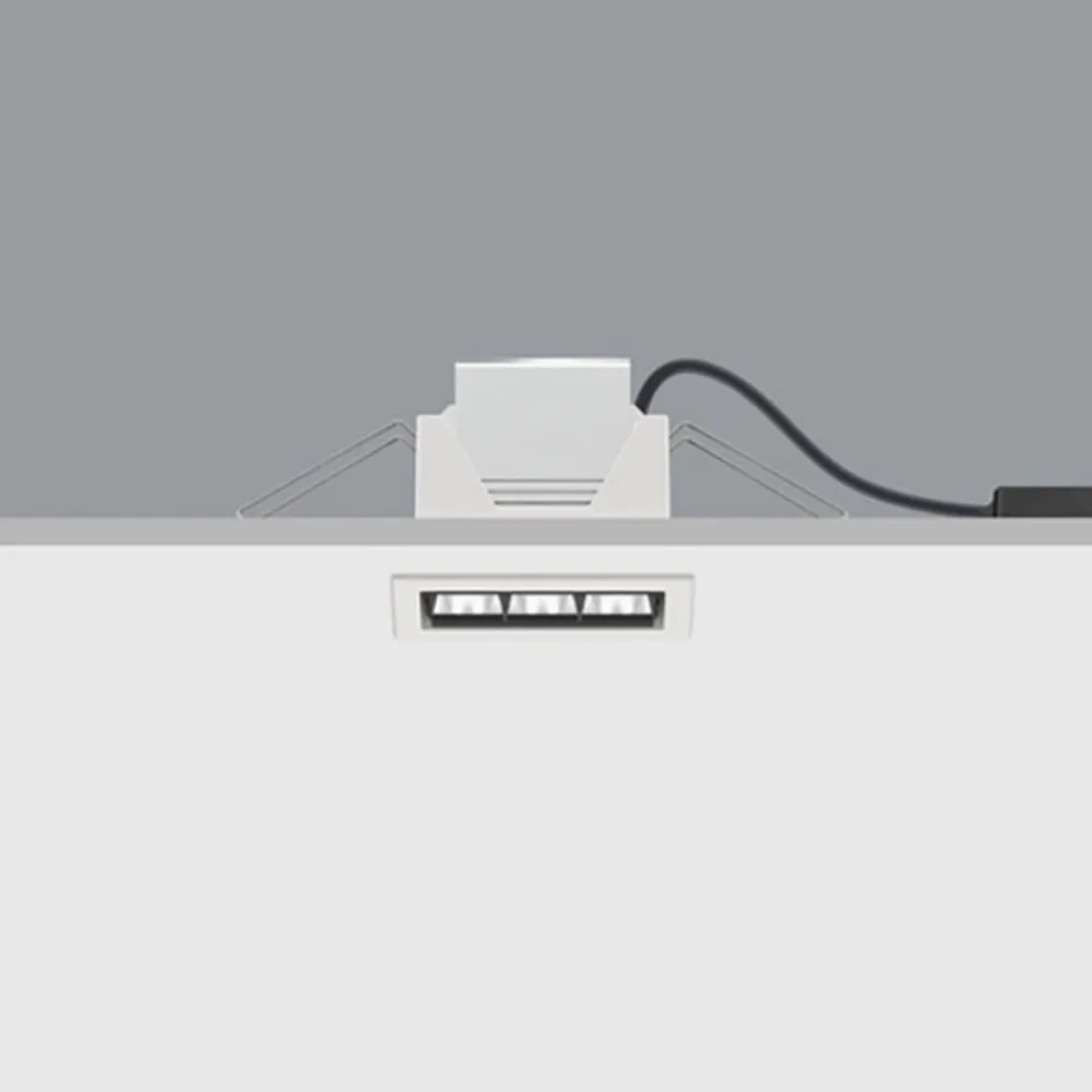 Compar LED-loftindbygningsarmatur fra ERCO som linsewallwasher, 6 W LED, til styring via Casambi-appen Compar-loftindbygningsarmaturet med flad, rektangulær aluminiumsramme udsender lyset fra de integrerede højeffekt-LED’er til den ene side ved hjælp af den særlige Softec-linseteknologi; lyset afskærmes direkte nedad i en vinkel på 70°. Det gør Compar ideel til indirekte belysning over væggen, hvor malerier osv. også præsenteres godt, eller til bred belysning af et varedisplay på siden. Takket være de medfølgende monteringsfjedre og plug-in-terminaltilslutningen er installationsarbejdet minimalt; kontroludstyret placeres separat bag loftet. Konfiguration og betjening sker ved hjælp af Casambi-appen på tablet/smartphone.