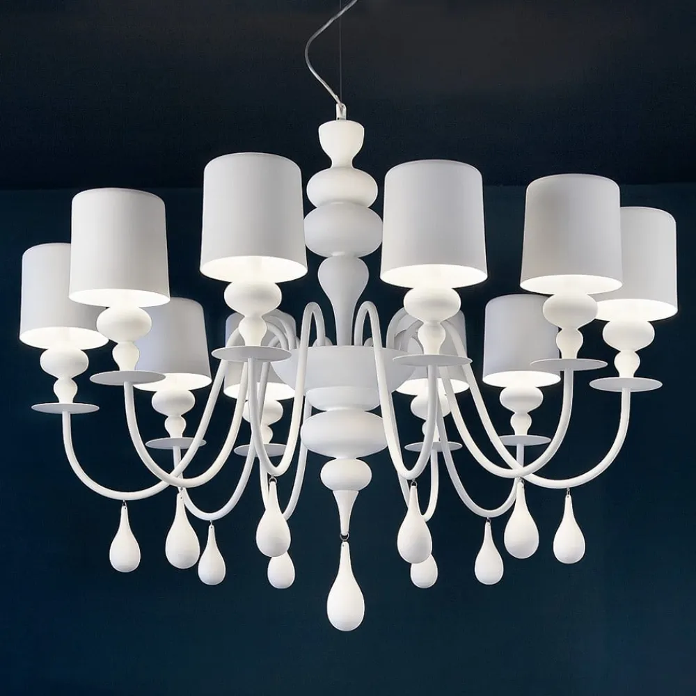 Lysekronen EVA er et enestående stilmiks, der både er en hyldest til den gammeldags lysekrone og fremstår som et nyt, fuldkommen moderne design. Lysekronen er udstyret med i alt 10 smukt udformede lampeskærme i aluminium. Når lyset reflekteres fra skærmenes hvide inderside, tager det sig usædvanlig fordelagtigt ud og bidrager til en harmonisk og stemningsfuldt elegant atmosfære. Endnu en ejendommelighed ved denne lampe er dens arme og de hængende pynteelementer, som alle er skabt af en smukt drejet træstruktur.