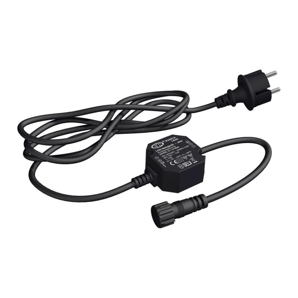 LED-strømforsyningsenhed K24012 til udendørs brugLed-strømforsyningsenheden med konstant spænding kan også bruges udendørs på grund af dens IP44-beskyttelsesklasse og indendørs i møbler. Strømforsyningsenheden er primært udstyret med et 1,8 m langt gummikabel med konturstik og sekundært med et 20 cm langt gummikabel med stikdåse til IP44-stiksystemet.- ikke dæmpbar