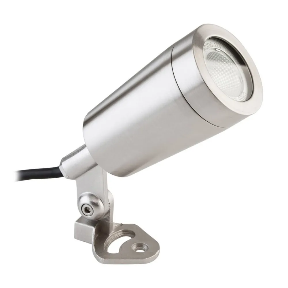 Drejelig LED-havespot PC6806 til IP44-stiksystem med jordspyd og monteringsfod, 12V/AC/DCT LED-havespot PC6806 er udstyret med et fem meter langt tilslutningskabel til IP44-stiksystem. En passende driver kan fås separat som tilbehør. Leveringsomfanget omfatter både en jordspyd til montering i jorden og en monteringsfod til montering i jordhøjde.Takket være et led kan PC6806 også drejes op til 60°. På grund af den høje beskyttelsesklasse kan denne LED-spot også anvendes under vand i en dybde på højst 1,5 meter. Den er fremstillet af rustfrit stål og afrundes af en glasrude, der beskytter det indbyggede LED-modul.Tekniske egenskaber / karakteristika- Inkluderer jordspyd og monteringsfod- Drejelig – Lysfordeling: symmetrisk- Mellembred fordeling: 21° til 40°- IP68 beskyttelse: beskyttet mod nedsænkning op til 1,5 m dybde- Spænding: 12V (AC/DC)- 5 m langt tilslutningskabel til IP44 plug-in systemBemærk: For at kunne betjene lampen er det absolut nødvendigt med en passende driver med IP44 plug-in systemtilslutning (se tilbehør).