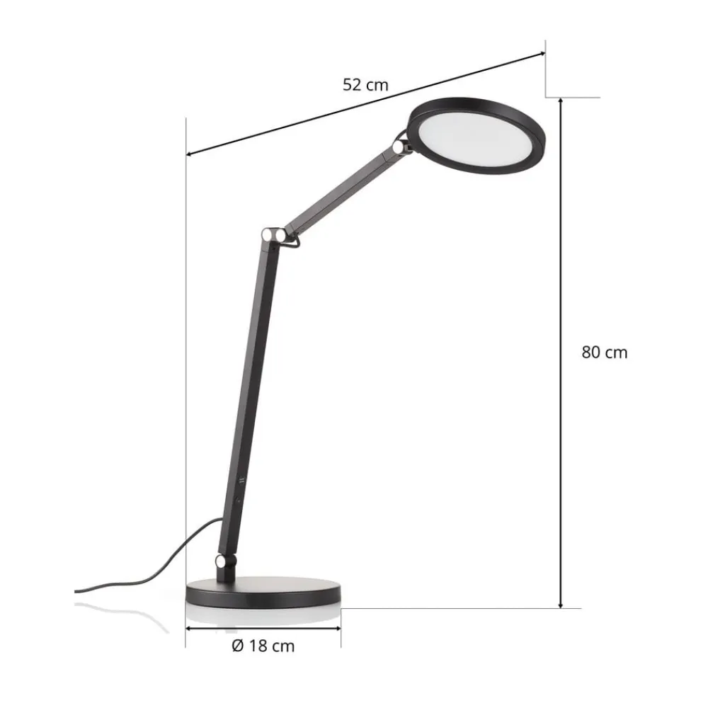 Regina LED-skrivebordslampe – justerbar, dæmpbar og justerbar lysfarve Regina LED-skrivebordslampen er en nyttig og fleksibel assistent til skrivebordet og stuebordet. Flere led gør det muligt at justere fremspringet og højden på stellet, som understøttes af en rund base, og orienteringen af den cirkulære skærm efter behov. Men det er ikke alt: To kontrolflader på den nederste del af stellet gør det muligt at regulere lysudbyttet i fem trin og justere farvetemperaturen i tre trin fra varm hvid 2.700 K til universal hvid 5.000 K. Regina giver derfor det rette lys til både afslappet avislæsning og koncentreret arbejde på hjemmekontoret.