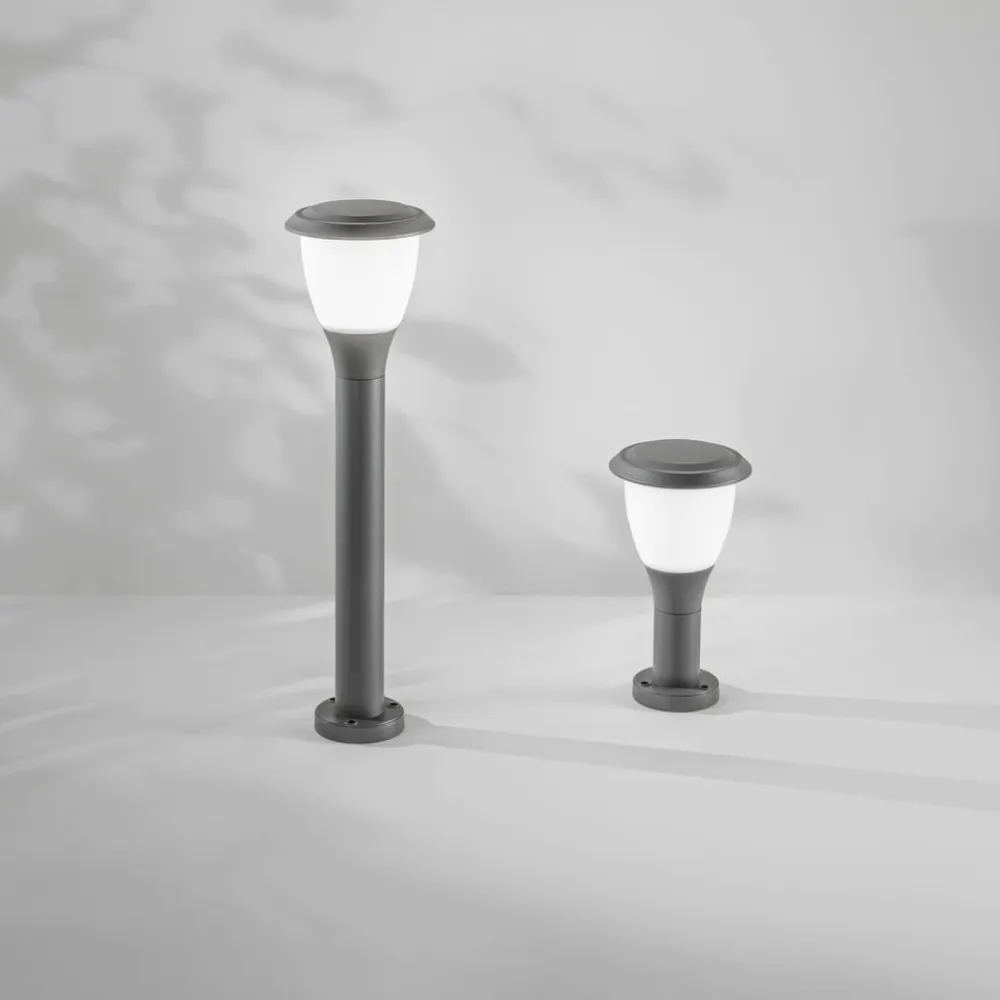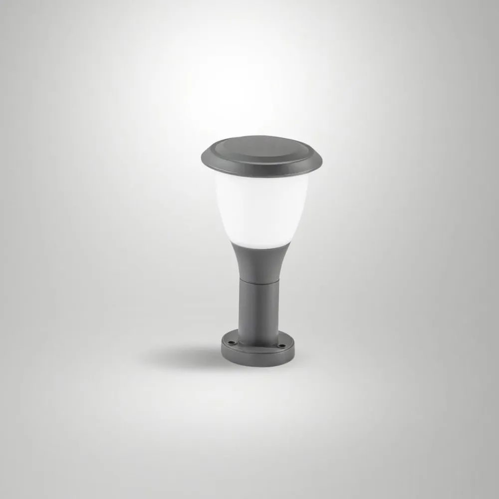 Sokkellampen Thiago kombinerer et moderne design med høj funktionalitet og er specielt designet til udendørs brug. Den er fremstillet af robust aluminium og polycarbonat og er en holdbar og modstandsdygtig løsning til belysning af udendørsarealer. Kapslingsgraden IP65 sikrer omfattende beskyttelse mod støv og vandstråler, hvilket gør den ideel til brug under forskellige vejrforhold.