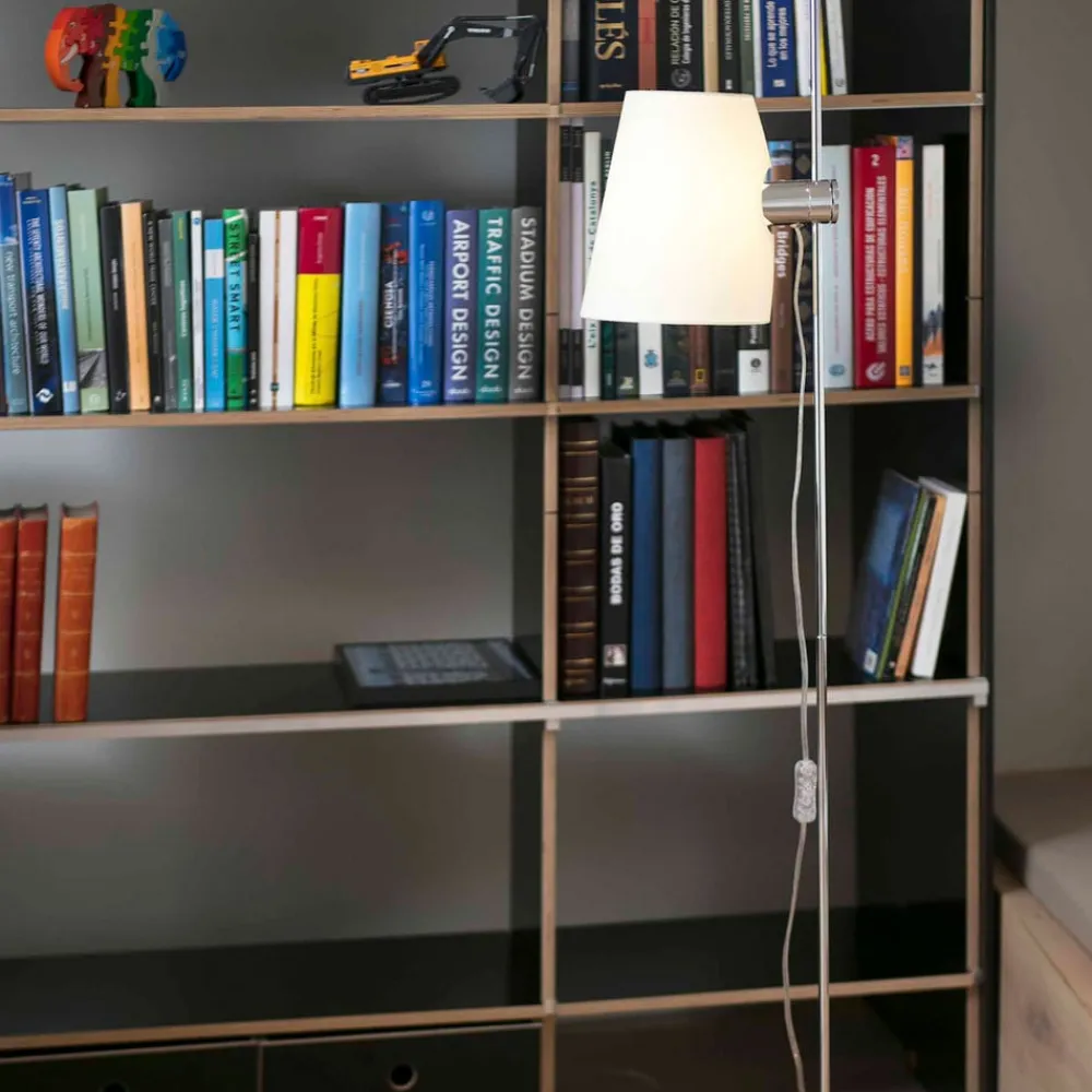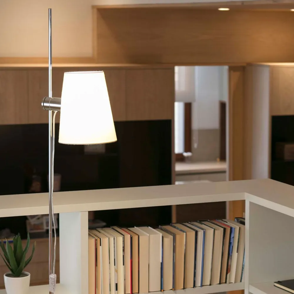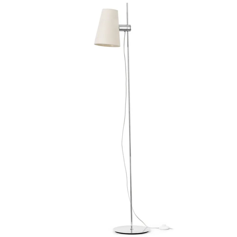 Designet er ret reserveret og klassisk. Lampeskærmen med E27- fatning er fastgjort til en lige, skinnende krommetalstang. Dette kan nu let justeres langs stangen og gør det således muligt at indstille lyskilden i forskellige højder. Uanset om lyset kræves en smule lavere for at læse i en lænestol eller højere for baggrundsbelysningen i en stue, kan dette ændres når som helst med den innovative teknologi uden stor indsats. Den bløde lyseffekt skabt af den beige tekstilskygge skaber en behagelig atmosfære. Stilfuldt, elegant og alligevel meget moderne.