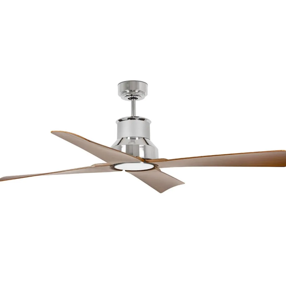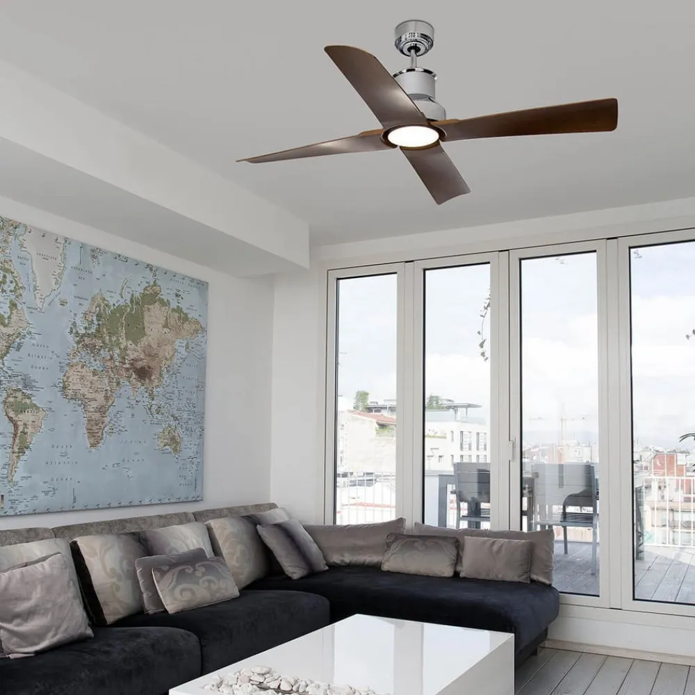 Komfortabelt udstyret Winche-loftventilator Det forkromede hus på Winche-loftventilatoren står i markant kontrast til plastbladene i et mørkt trælook. Winche-loftventilatoren, som er velegnet til rum på op til 25 m², kan også suppleres med et lyskit, hvis det er nødvendigt (medfølger ikke, fås som tilbehør). Funktioner Udstyret med frem- og tilbageløb kan Winche-loftventilatoren bruges hele året rundt – om sommeren til køling og om vinteren til jævn fordeling af rumluften.