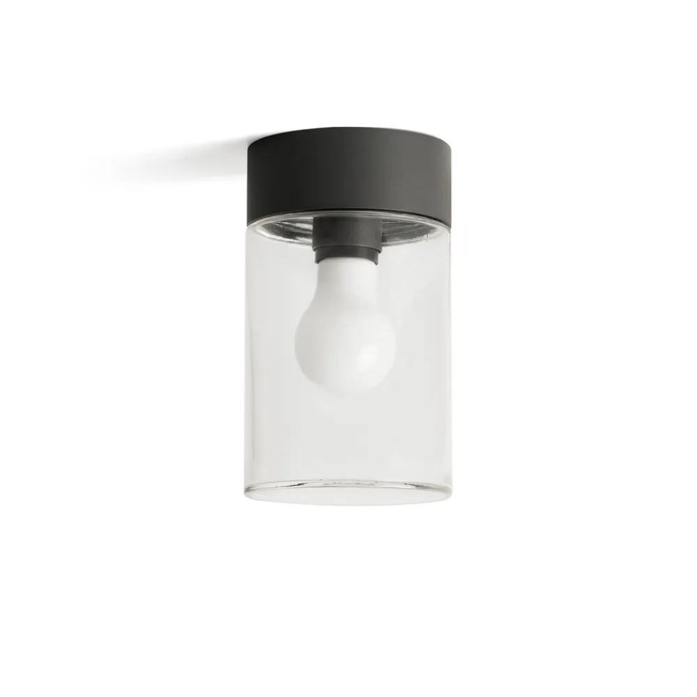 Kila udendørs loftslampe er fremstillet af antracitfarvet aluminium. Den cylindriske skærm af glas, hvori en E27-fatning venter på en effektiv LED-lampe på højst 15 watt, er problemfrit forbundet.
