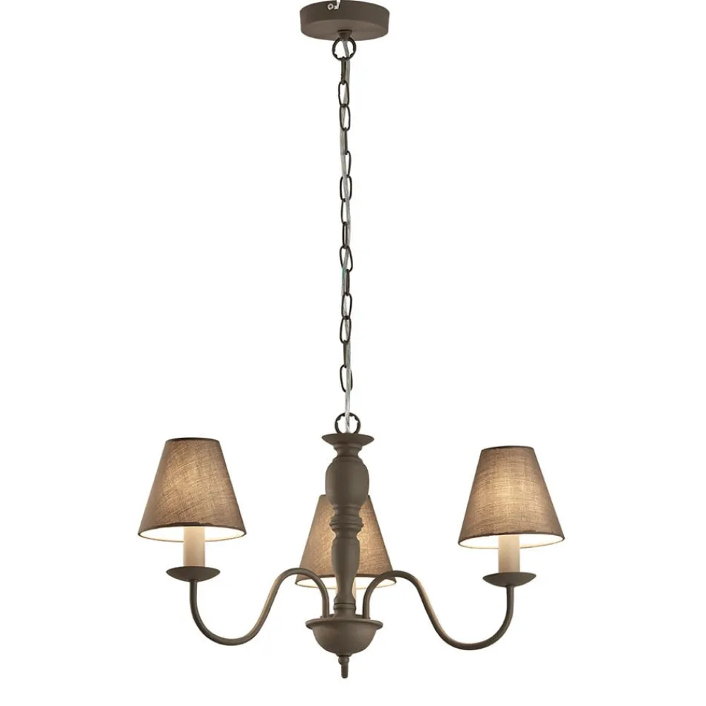 Fatima lysekrone har en buet stel, der minder om bølgespor. Grundmalingen på stålelementerne er grå, ligesom paraplyernes stof. Det er ideelt som spisebordsbelysning med de tre stofskygger vendt opad, og lyset oversvømmer derfor rummet meget behageligt og bidrager således til større komfort. For at belyse bordet på en energibesparende måde kan moderne LED-lamper bruges i E14-stikkene udover glødelamper op til 40 W.