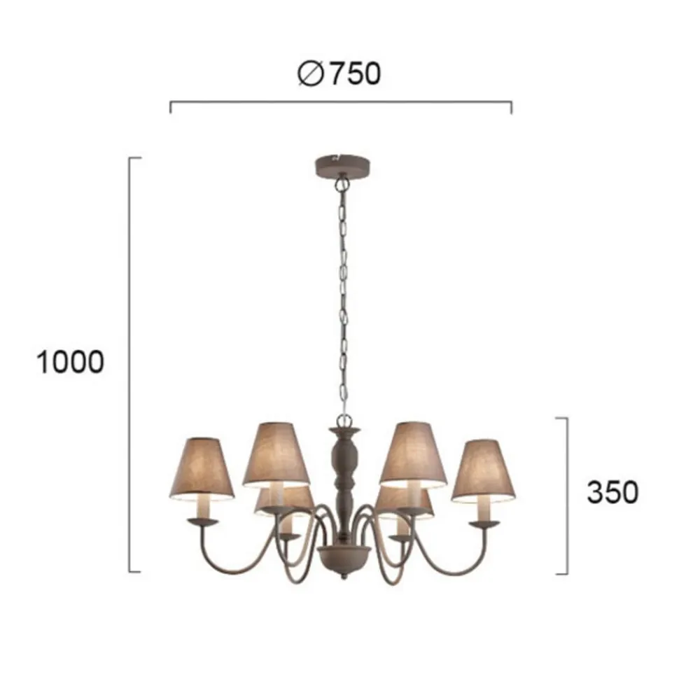 Fatima- lysekrone med seks flammer med sit rustikke design fanger straks øjet. lysekrone består af seks arme og lampeskærme af stof og holdt i gråt. Den stilfuldt buede stel kan let kombineres i landstil og fungerer som et elegant dekorativt element. De seks pærer med E14- fatning (ikke konserveret) sikrer meget god rumbelysning.