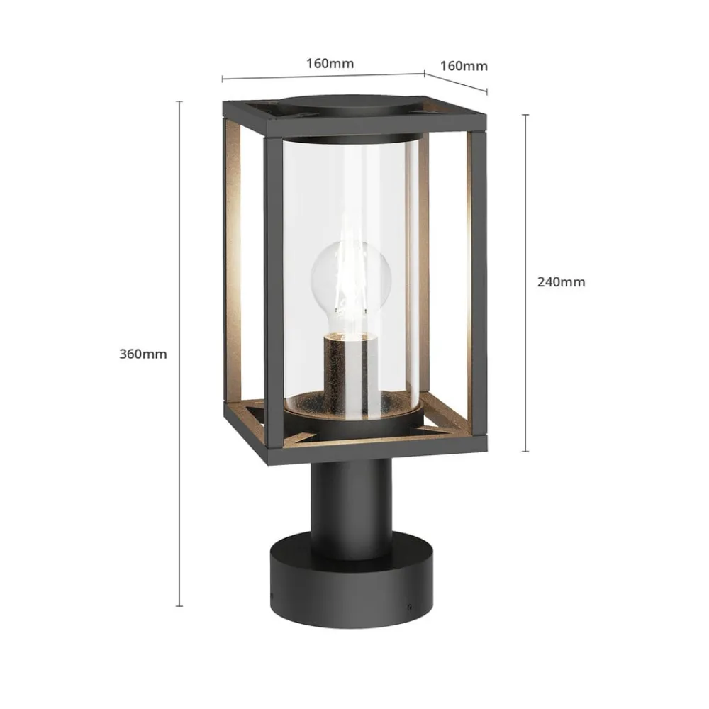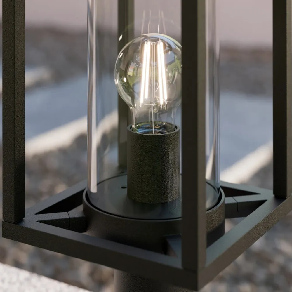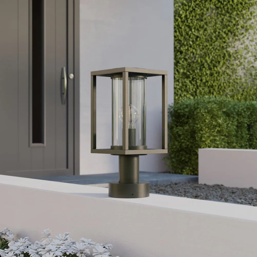 Moderne Ferda sokkellampe til udendørs brug Antracitfarvet aluminium med en glascylinder, der beskytter den indre lyskilde – det er den moderne Ferda sokkellampe. Armaturet har et moderne geometrisk design, og lampeskærmen er åben. Det gør, at lyset kan spotlightes uhindret i alle retninger, da den beskyttende glasskærm også er gennemsigtig. Ferda giver derfor et klart og sikkert lys, som er ideelt til forskellige områder i huset. Takket være de anvendte materialer og den robuste konstruktion er sokkellampen Ferda velegnet til mange forskellige steder.