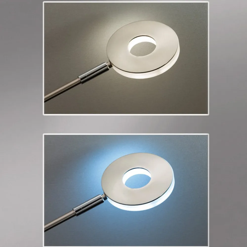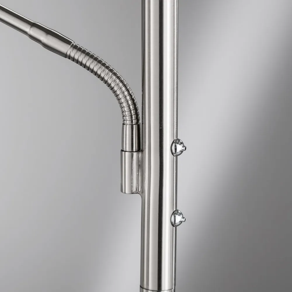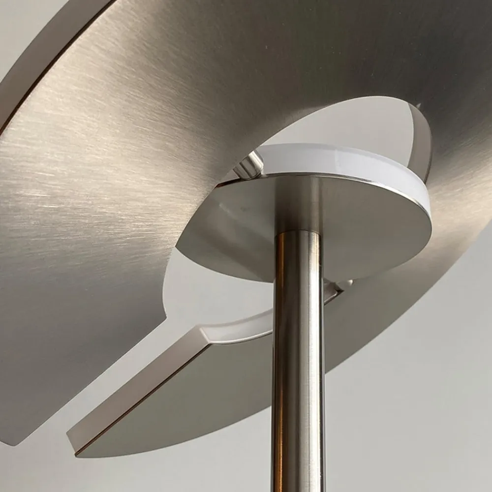 Moderne LED-gulvlampe Dent – loftlampe med læselampe, justerbar lysstyrke og farvetemperatur LED-gulvlampen Dent er en alsidig, moderne lyskilde til opholdsrummet. Metalrammen har et rundt hoved, der giver indirekte belysning hen over loftet som en projektør. Der er også en sidemonteret læselampe med et justerbart hoved. Der er to trykknapper i midten af stativet, som gør det muligt at styre de to lyskilder separat. Ud over at skifte er det også muligt at dæmpe trinløst og justere farvetemperaturen i tre trin fra varmhvid til universalhvid – Lysfarve justerbar i tre trin fra varmhvid til universalhvid – Med berøringsdæmper – Justerbare hoveder