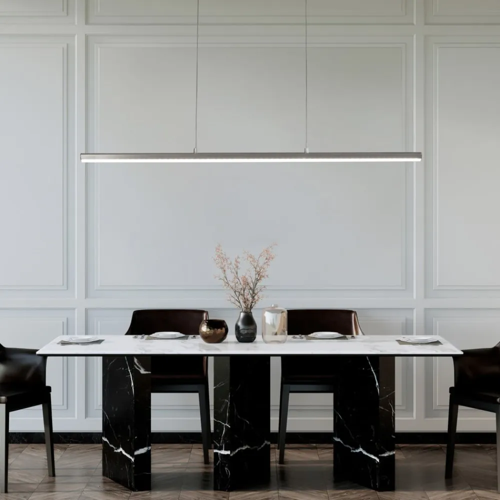 Et særligt kendetegn ved Borena-hængelampen er dens højdejustering, der gør det muligt at tilpasse den fleksibelt til forskellige rumhøjder og belysningsbehov. Desuden er lampen dæmpbar via fjernbetjeningen.