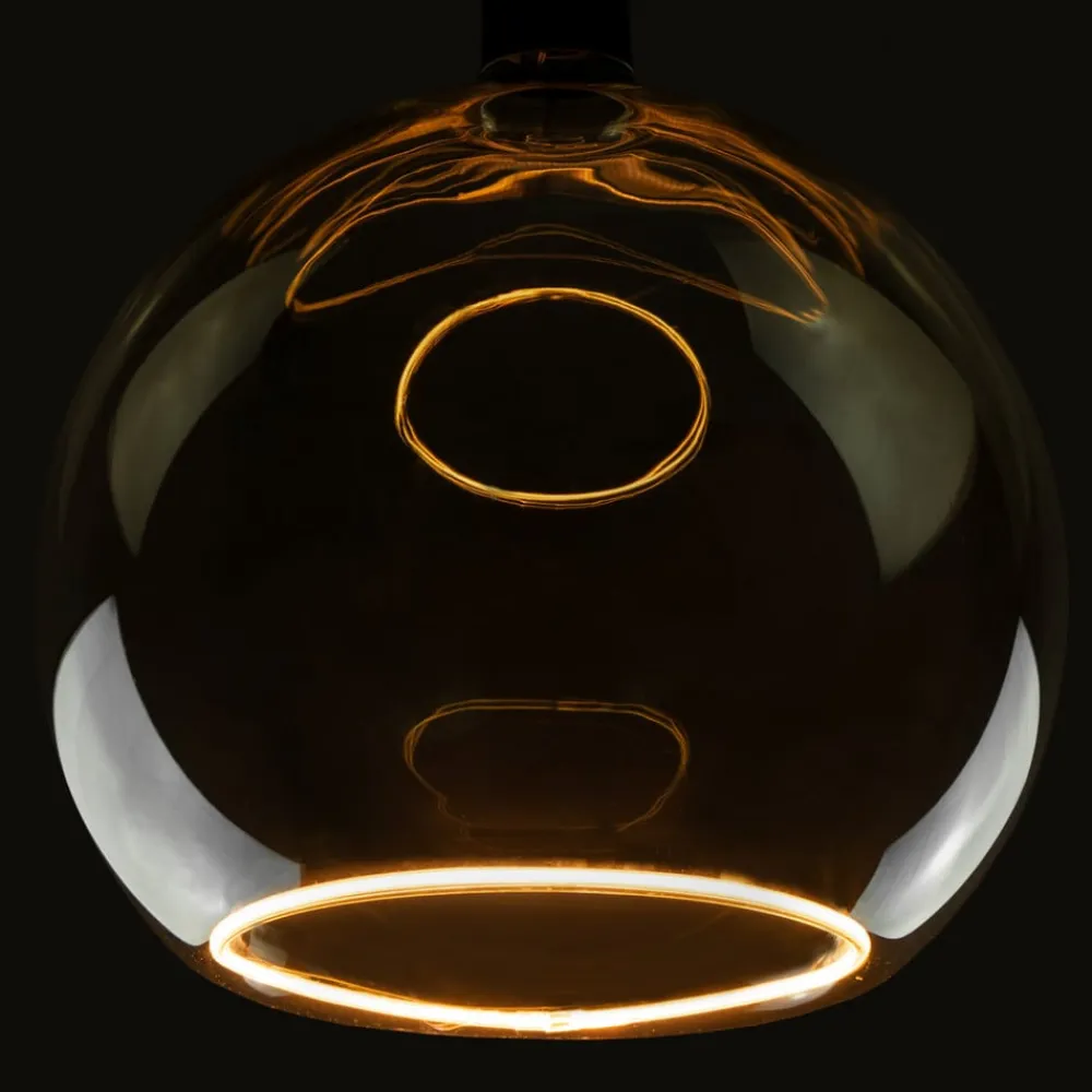 Med gråtonet glas, der er åbent i toppen – LED-kuglelampen Floating i G300, E27, 8 Watt Det røggrå glas, åbningen i toppen, den gyldne sokkel og den imponerende størrelse gør denne E27-kuglelampe fra Floating-serien til noget særligt. Den kommer helt uden skærm og opgraderer straks enkle armaturer. Med sit særligt hyggelige lys i varm hvid skaber den en behagelig stemning og kan også reguleres i lysstyrke. Floating-serien fra SEGULA er udstyret med et dobbeltvægget glas med en røget grå nuance og patenteret LED soft filament indbygget i det som en ring. Kan dæmpes med de fleste kommercielt tilgængelige lysdæmpere – Tildelt Plus X Award 2022/2023 i kategorierne Innovation, Høj kvalitet og Design