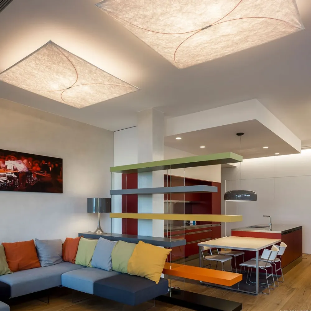 Stofbeklædt ARIETTE loftlampe fra FLOS ARIETTE loftlampen fra FLOS er i sandhed en klassiker, da den blev designet af Tobia Scarpa tilbage i 1973, hvilket taler sit tydelige sprog om dens tidløse kvalitet. Under stofskærmen med den strukturerede fiberoptik sidder der fire traditionelle glødepærer, som giver et ret diffust, næsten hyggeligt lys med en meget varm tone. Særligt genialt, og man kan se det gennem stoffet: Det er ikke skruer, der holder hele strukturen oppe – nej, man kommer til at tænke på dage i det fri, hvor man kun skulle klare sig med det allermest nødvendige, for de røde glasfiberbuer indeni, som er dækket af det hvide stof, ligner teltstænger.