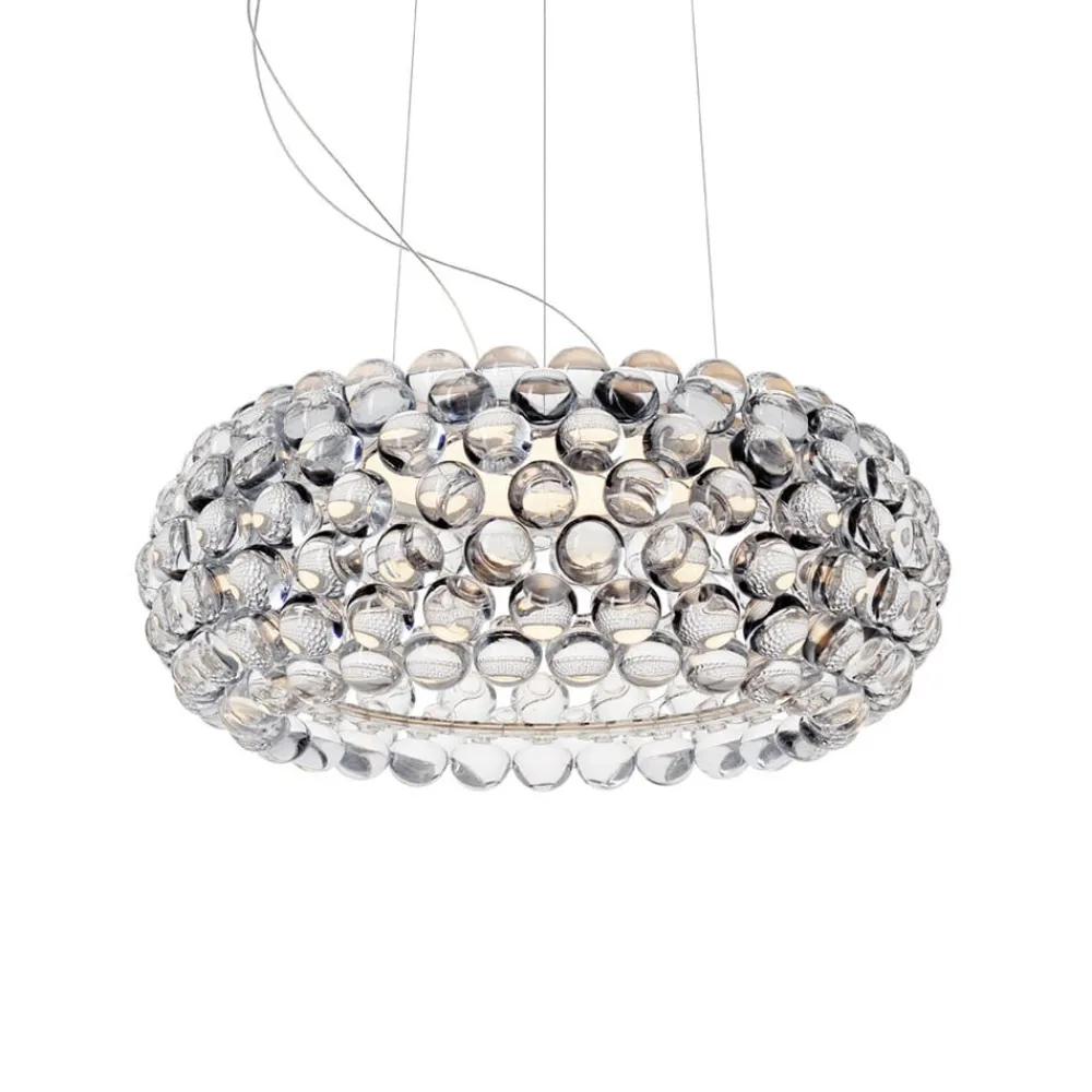 Foscarini Caboche Plus media – elegant pendel med R7s-holder Selvom den imponerende Caboche Plus media-pendel først blev skabt i 2005, er den allerede en ægte designklassiker. Caboche-serien blev skabt af designerne Patricia Urquiola og Eliana Gerotto for producenten Foscarini. Inspireret af et perlearmbånd er skærmen over det hele besat med gennemsigtige PMMA-kugler, der giver pendlen udseende som et smykke og en elegant gnist. Caboche Plus media-pendlen er et ægte blikfang i ethvert rum. Over borde giver armaturet direkte, blændfrit lys nedad samt et særligt lysspil hele vejen rundt takket være perlerne. Plus-versionen er udstyret med gennemsigtige plaststrimler, der fungerer som holdere til perlerne og lader lyseffekten udfolde sig frit. En R7s stanglampe kan bruges som lyskilde efter behov.