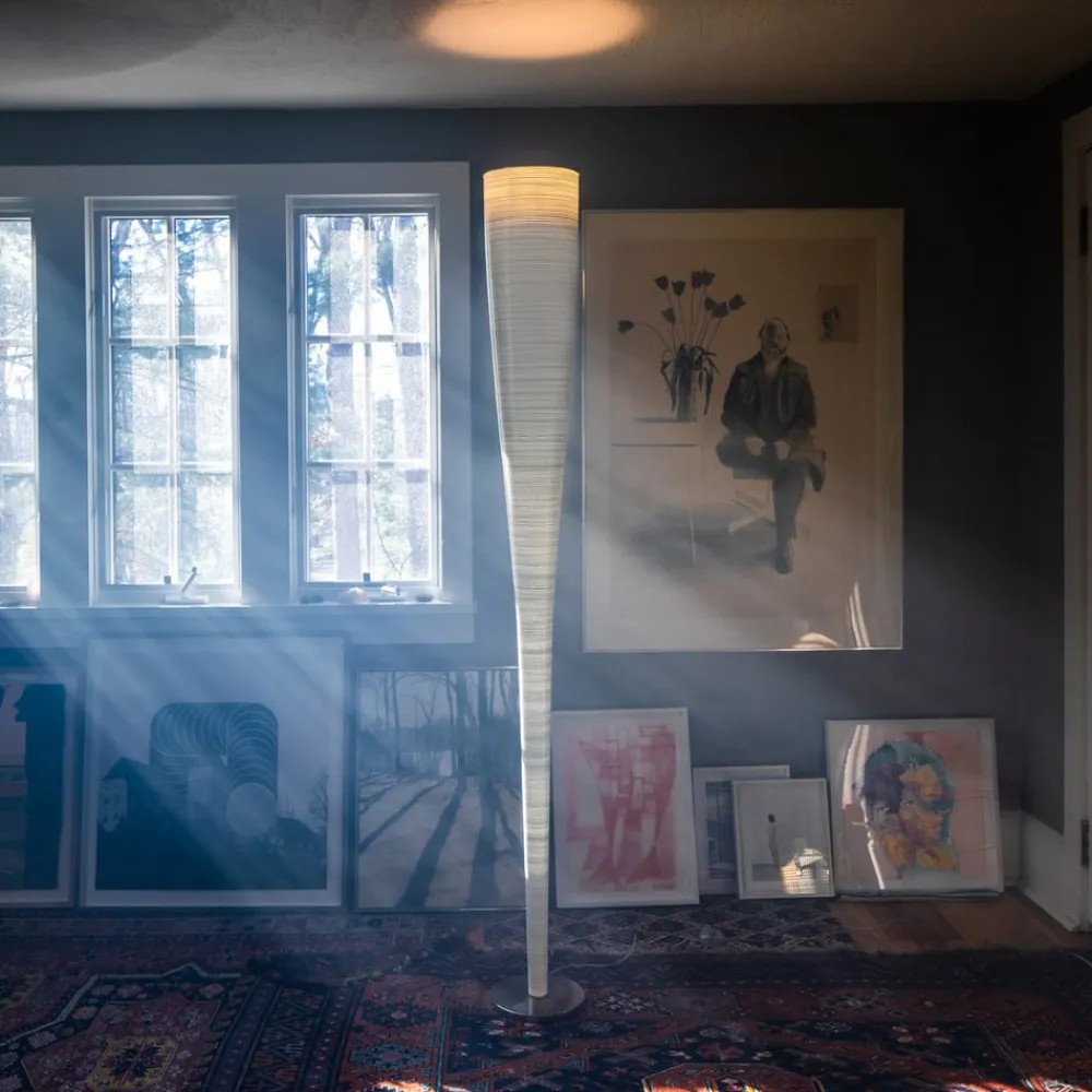 Marc Sadler har designet Mite Anniversario LED-gulvlampen i form af en smal kegle for det italienske belysningsfirma Foscarini. På en base af sort Marquiña marmor, en dyb sort natursten med uregelmæssige korn, rejser skyggen sig som en slank kegle, der er åben i toppen. Den består af glasvæv og en wire af kulfiber, som spiralerer nedad og kondenserer mod foden.